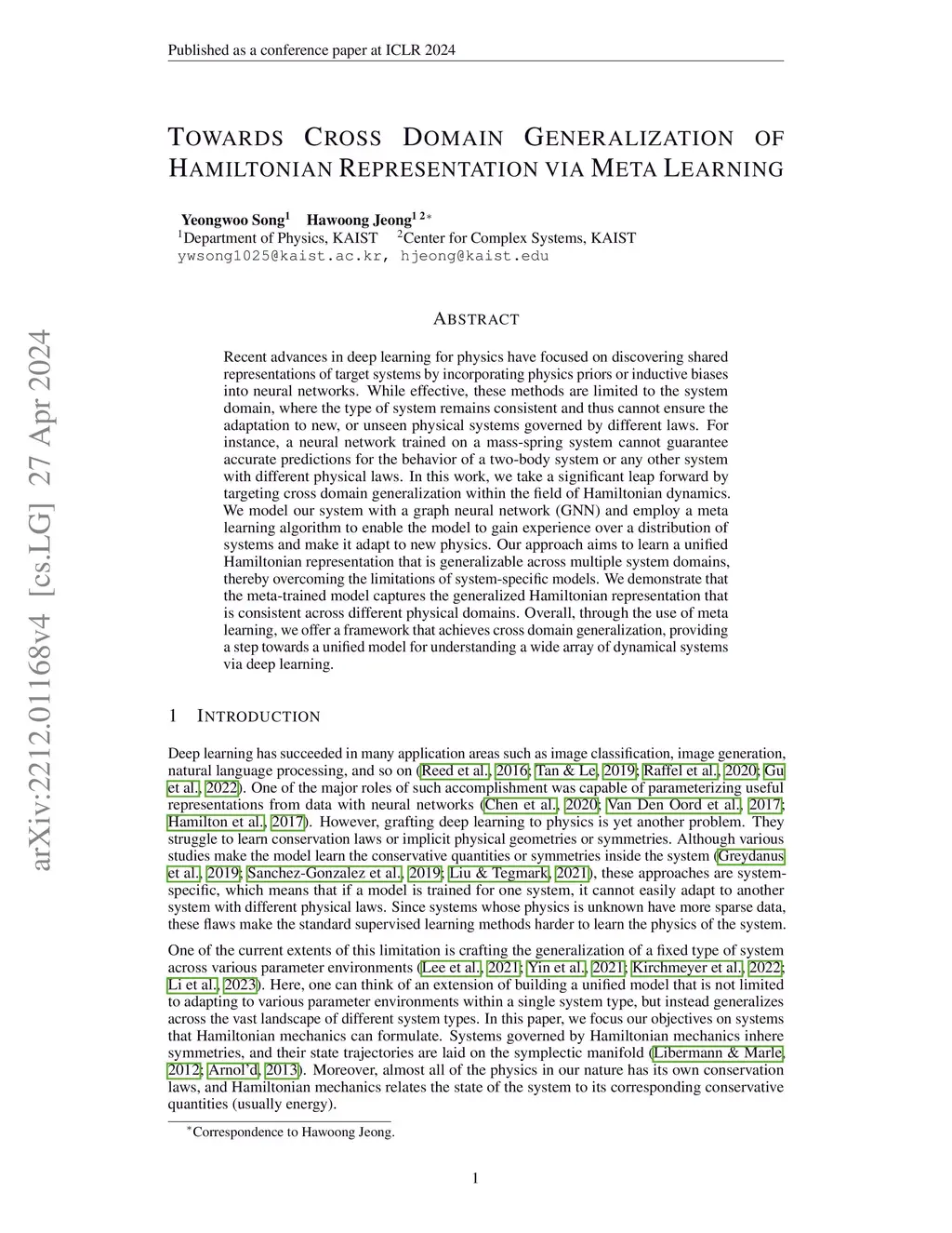 Recent advances in deep learning for physics have focused on discovering shared representations of target systems by incorporating physics priors or inductive biases into neural networks. While effective, these methods are limited to the system domain, where the type of system remains consistent and thus cannot ensure the adaptation to new, or unseen physical systems governed by different laws. For instance, a neural network trained on a mass-spring system cannot guarantee accurate predictions for the behavior of a two-body system or any other system with different physical laws. In this work, we take a significant leap forward by targeting cross domain generalization within the field of Hamiltonian dynamics. We model our system with a graph neural network (GNN) and employ a meta learning algorithm to enable the model to gain experience over a distribution of systems and make it adapt to new physics. Our approach aims to learn a unified Hamiltonian representation that is generalizable across multiple system domains, thereby overcoming the limitations of system-specific models. We demonstrate that the meta-trained model captures the generalized Hamiltonian representation that is consistent across different physical domains. Overall, through the use of meta learning, we offer a framework that achieves cross domain generalization, providing a step towards a unified model for understanding a wide array of dynamical systems via deep learning.
