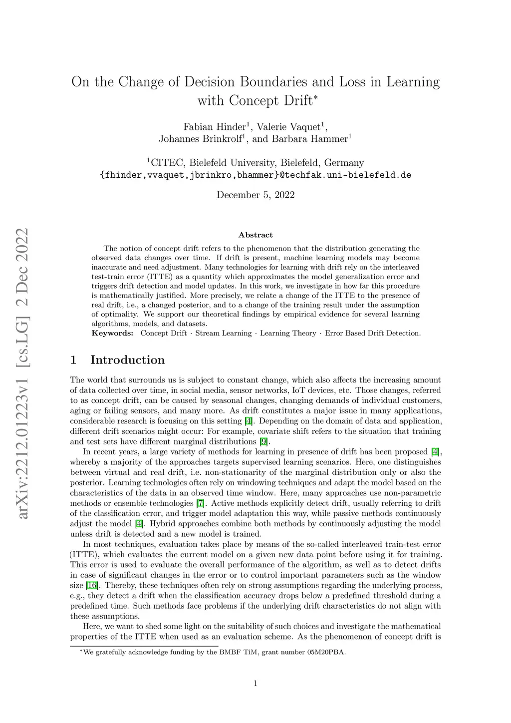 The notion of concept drift refers to the phenomenon that the distribution generating the observed data changes over time. If drift is present, machine learning models may become inaccurate and need adjustment. Many technologies for learning with drift rely on the interleaved test-train error (ITTE) as a quantity which approximates the model generalization error and triggers drift detection and model updates. In this work, we investigate in how far this procedure is mathematically justified. More precisely, we relate a change of the ITTE to the presence of real drift, i.e., a changed posterior, and to a change of the training result under the assumption of optimality. We support our theoretical findings by empirical evidence for several learning algorithms, models, and datasets.