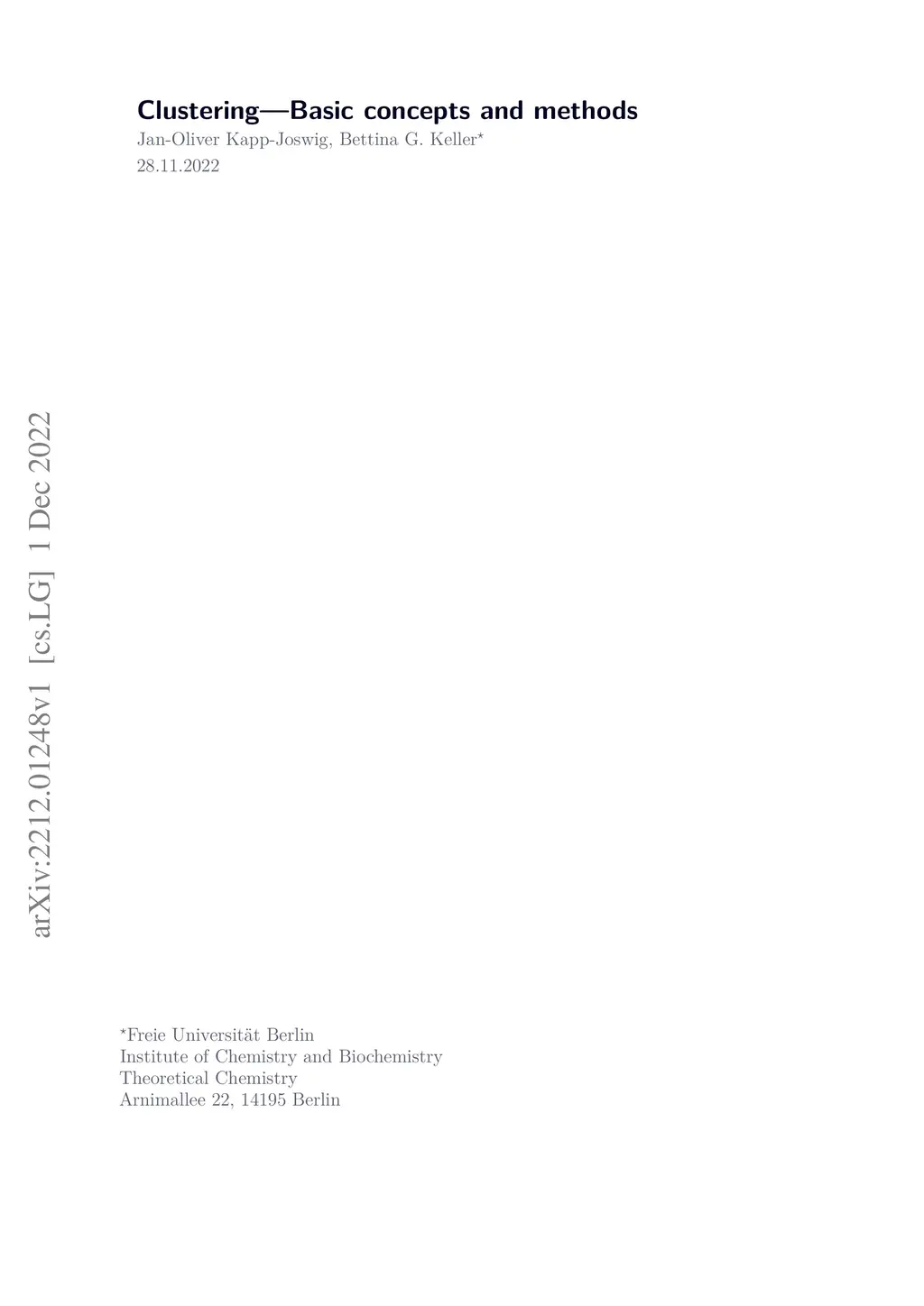 We review clustering as an analysis tool and the underlying concepts from an introductory perspective. What is clustering and how can clusterings be realised programmatically? How can data be represented and prepared for a clustering task? And how can clustering results be validated? Connectivity-based versus prototype-based approaches are reflected in the context of several popular methods: single-linkage, spectral embedding, k-means, and Gaussian mixtures are discussed as well as the density-based protocols (H)DBSCAN, Jarvis-Patrick, CommonNN, and density-peaks.
