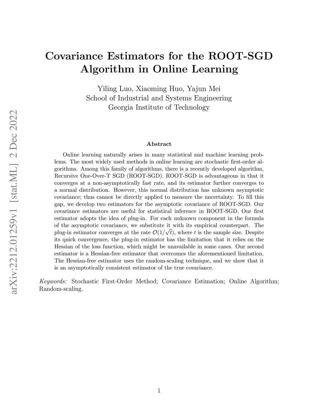 Online learning naturally arises in many statistical and machine learning problems. The most widely used methods in online learning are stochastic first-order algorithms. Among this family of algorithms, there is a recently developed algorithm, Recursive One-Over-T SGD (ROOT-SGD). ROOT-SGD is advantageous in that it converges at a non-asymptotically fast rate, and its estimator further converges to a normal distribution. However, this normal distribution has unknown asymptotic covariance; thus cannot be directly applied to measure the uncertainty. To fill this gap, we develop two estimators for the asymptotic covariance of ROOT-SGD. Our covariance estimators are useful for statistical inference in ROOT-SGD. Our first estimator adopts the idea of plug-in. For each unknown component in the formula of the asymptotic covariance, we substitute it with its empirical counterpart. The plug-in estimator converges at the rate , where is the sample size. Despite its quick convergence, the plug-in estimator has the limitation that it relies on the Hessian of the loss function, which might be unavailable in some cases. Our second estimator is a Hessian-free estimator that overcomes the aforementioned limitation. The Hessian-free estimator uses the random-scaling technique, and we show that it is an asymptotically consistent estimator of the true covariance.