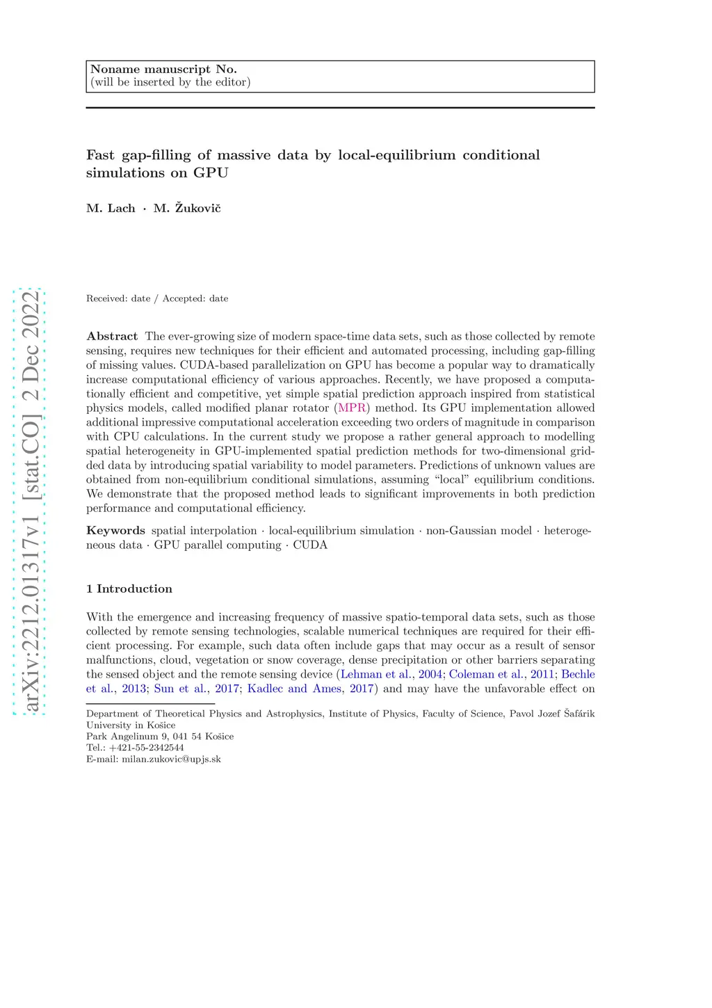 The ever-growing size of modern space-time data sets, such as those collected by remote sensing, requires new techniques for their efficient and automated processing, including gap-filling of missing values. CUDA-based parallelization on GPU has become a popular way to dramatically increase computational efficiency of various approaches. Recently, we have proposed a computationally efficient and competitive, yet simple spatial prediction approach inspired from statistical physics models, called modified planar rotator (MPR) method. Its GPU implementation allowed additional impressive computational acceleration exceeding two orders of magnitude in comparison with CPU calculations. In the current study we propose a rather general approach to modelling spatial heterogeneity in GPU-implemented spatial prediction methods for two-dimensional gridded data by introducing spatial variability to model parameters. Predictions of unknown values are obtained from non-equilibrium conditional simulations, assuming ``local'' equilibrium conditions. We demonstrate that the proposed method leads to significant improvements in both prediction performance and computational efficiency.