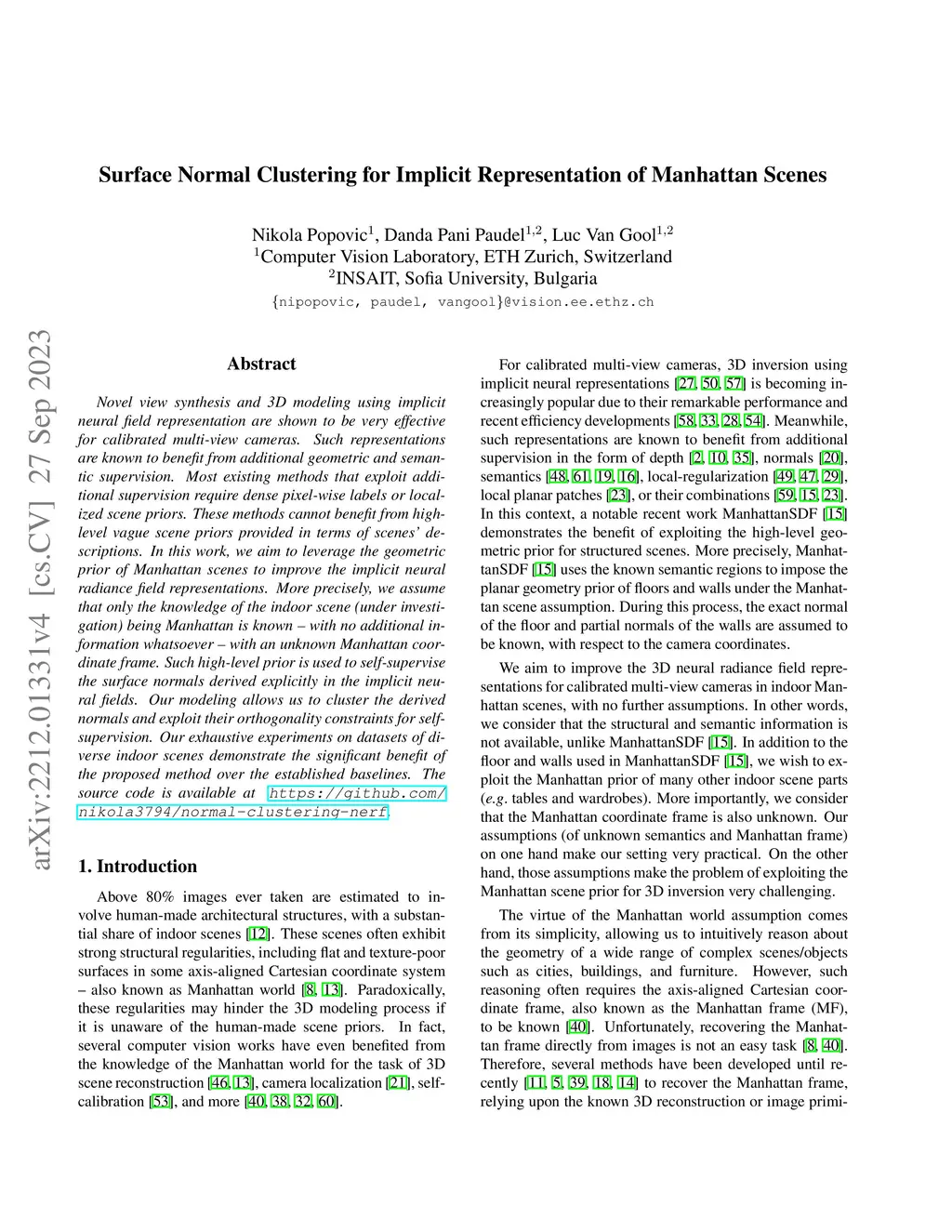 Novel view synthesis and 3D modeling using implicit neural field representation are shown to be very effective for calibrated multi-view cameras. Such representations are known to benefit from additional geometric and semantic supervision. Most existing methods that exploit additional supervision require dense pixel-wise labels or localized scene priors. These methods cannot benefit from high-level vague scene priors provided in terms of scenes' descriptions. In this work, we aim to leverage the geometric prior of Manhattan scenes to improve the implicit neural radiance field representations. More precisely, we assume that only the knowledge of the indoor scene (under investigation) being Manhattan is known -- with no additional information whatsoever -- with an unknown Manhattan coordinate frame. Such high-level prior is used to self-supervise the surface normals derived explicitly in the implicit neural fields. Our modeling allows us to cluster the derived normals and exploit their orthogonality constraints for self-supervision. Our exhaustive experiments on datasets of diverse indoor scenes demonstrate the significant benefit of the proposed method over the established baselines. The source code is available at https://github.com/nikola3794/normal-clustering-nerf.