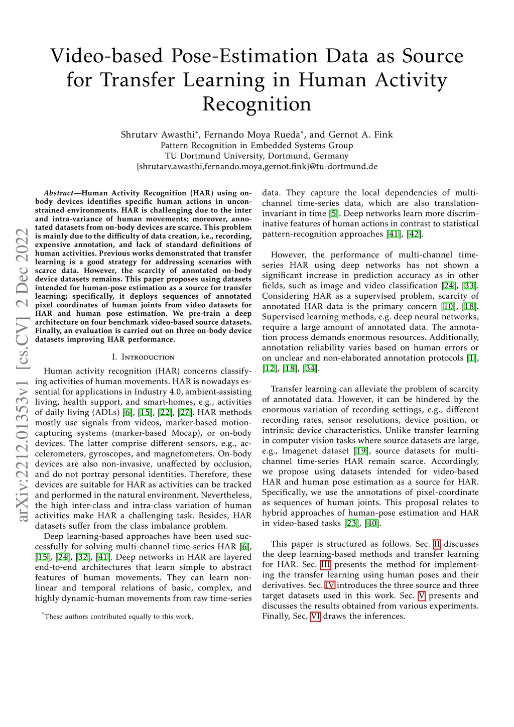 Human Activity Recognition (HAR) using on-body devices identifies specific human actions in unconstrained environments. HAR is challenging due to the inter and intra-variance of human movements; moreover, annotated datasets from on-body devices are scarce. This problem is mainly due to the difficulty of data creation, i.e., recording, expensive annotation, and lack of standard definitions of human activities. Previous works demonstrated that transfer learning is a good strategy for addressing scenarios with scarce data. However, the scarcity of annotated on-body device datasets remains. This paper proposes using datasets intended for human-pose estimation as a source for transfer learning; specifically, it deploys sequences of annotated pixel coordinates of human joints from video datasets for HAR and human pose estimation. We pre-train a deep architecture on four benchmark video-based source datasets. Finally, an evaluation is carried out on three on-body device datasets improving HAR performance.