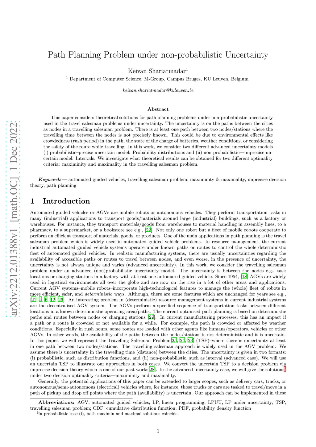 This paper considers theoretical solutions for path planning problems under non-probabilistic uncertainty used in the travel salesman problems under uncertainty. The uncertainty is on the paths between the cities as nodes in a travelling salesman problem. There is at least one path between two nodes/stations where the travelling time between the nodes is not precisely known. This could be due to environmental effects like crowdedness (rush period) in the path, the state of the charge of batteries, weather conditions, or considering the safety of the route while travelling. In this work, we consider two different advanced uncertainty models (i) probabilistic-precise uncertain model: Probability distributions and (ii) non-probabilistic--imprecise uncertain model: Intervals. We investigate what theoretical results can be obtained for two different optimality criteria: maximinity and maximality in the travelling salesman problem.