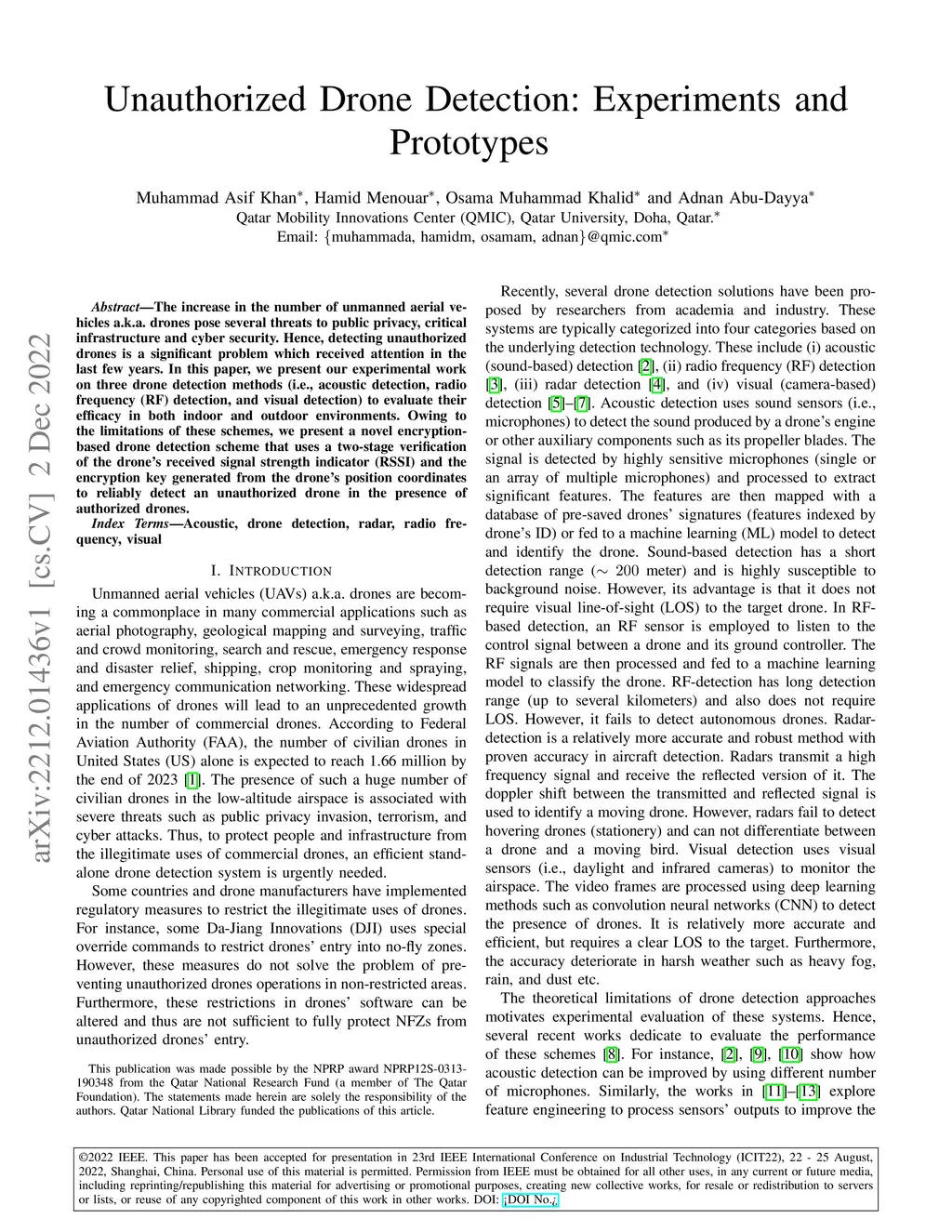 The increase in the number of unmanned aerial vehicles a.k.a. drones pose several threats to public privacy, critical infrastructure and cyber security. Hence, detecting unauthorized drones is a significant problem which received attention in the last few years. In this paper, we present our experimental work on three drone detection methods (i.e., acoustic detection, radio frequency (RF) detection, and visual detection) to evaluate their efficacy in both indoor and outdoor environments. Owing to the limitations of these schemes, we present a novel encryption-based drone detection scheme that uses a two-stage verification of the drone's received signal strength indicator (RSSI) and the encryption key generated from the drone's position coordinates to reliably detect an unauthorized drone in the presence of authorized drones.