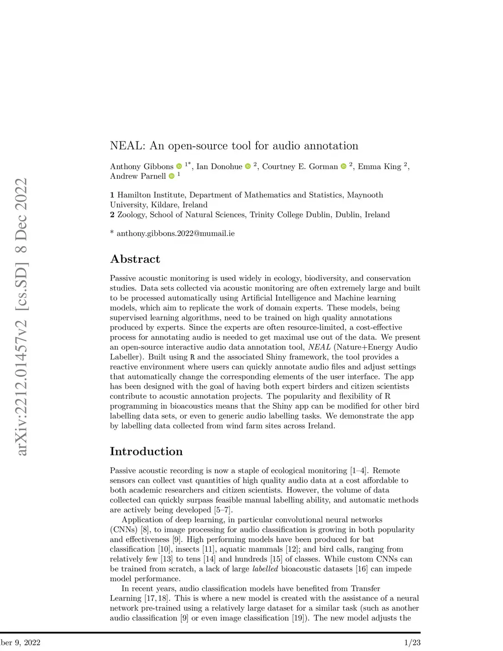 Passive acoustic monitoring is used widely in ecology, biodiversity, and conservation studies. Data sets collected via acoustic monitoring are often extremely large and built to be processed automatically using Artificial Intelligence and Machine learning models, which aim to replicate the work of domain experts. These models, being supervised learning algorithms, need to be trained on high quality annotations produced by experts. Since the experts are often resource-limited, a cost-effective process for annotating audio is needed to get maximal use out of the data. We present an open-source interactive audio data annotation tool, NEAL (Nature+Energy Audio Labeller). Built using R and the associated Shiny framework, the tool provides a reactive environment where users can quickly annotate audio files and adjust settings that automatically change the corresponding elements of the user interface. The app has been designed with the goal of having both expert birders and citizen scientists contribute to acoustic annotation projects. The popularity and flexibility of R programming in bioacoustics means that the Shiny app can be modified for other bird labelling data sets, or even to generic audio labelling tasks. We demonstrate the app by labelling data collected from wind farm sites across Ireland.