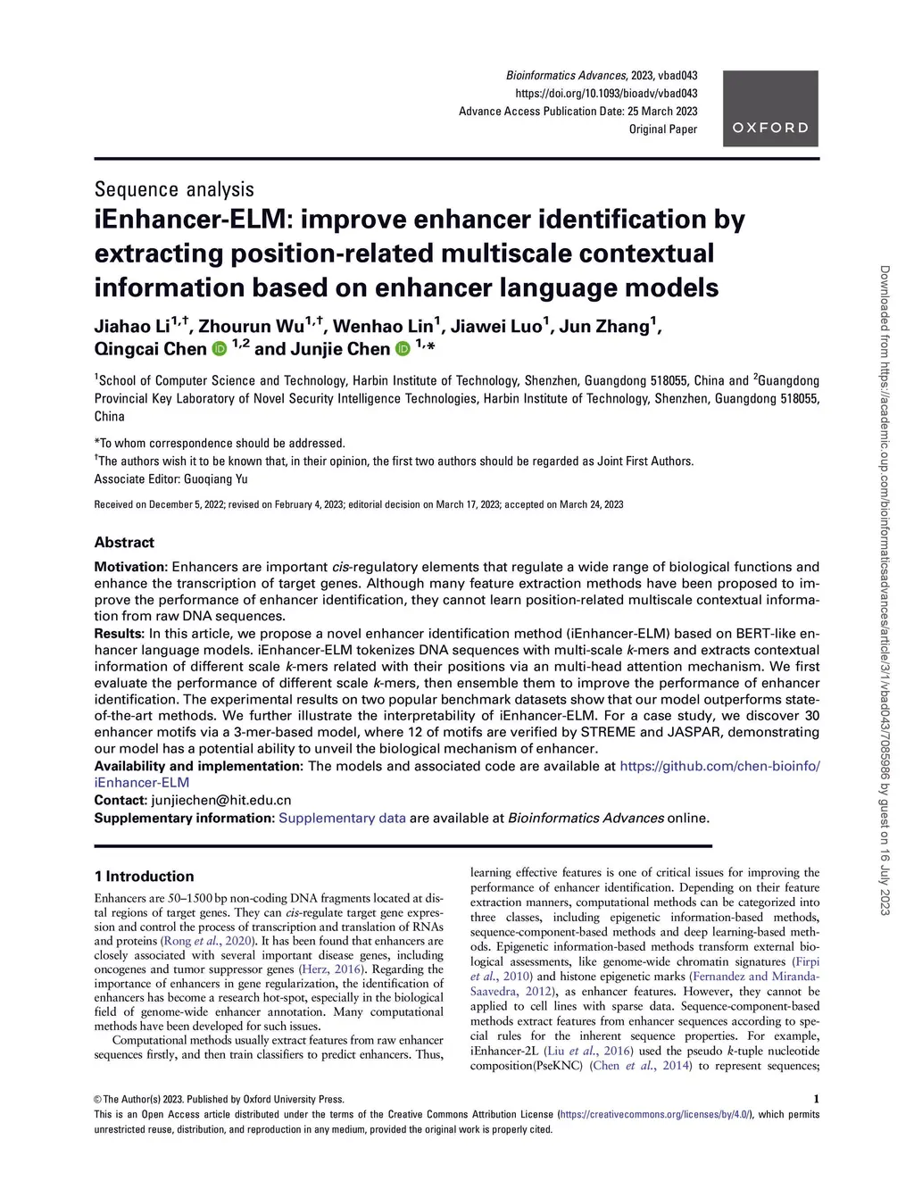Motivation: Enhancers are important cis-regulatory elements that regulate a wide range of biological functions and enhance the transcription of target genes. Although many feature extraction methods have been proposed to improve the performance of enhancer identification, they cannot learn position-related multiscale contextual information from raw DNA sequences. Results: In this article, we propose a novel enhancer identification method (iEnhancer-ELM) based on BERT-like enhancer language models. iEnhancer-ELM tokenizes DNA sequences with multi-scale k-mers and extracts contextual information of different scale k-mers related with their positions via an multi-head attention mechanism. We first evaluate the performance of different scale k-mers, then ensemble them to improve the performance of enhancer identification. The experimental results on two popular benchmark datasets show that our model outperforms stateof-the-art methods. We further illustrate the interpretability of iEnhancer-ELM. For a case study, we discover 30 enhancer motifs via a 3-mer-based model, where 12 of motifs are verified by STREME and JASPAR, demonstrating our model has a potential ability to unveil the biological mechanism of enhancer. Availability and implementation: The models and associated code are available at https://github.com/chen-bioinfo/iEnhancer-ELM Contact: junjiechen@hit.edu.cn Supplementary information: Supplementary data are available at Bioinformatics Advances online.
