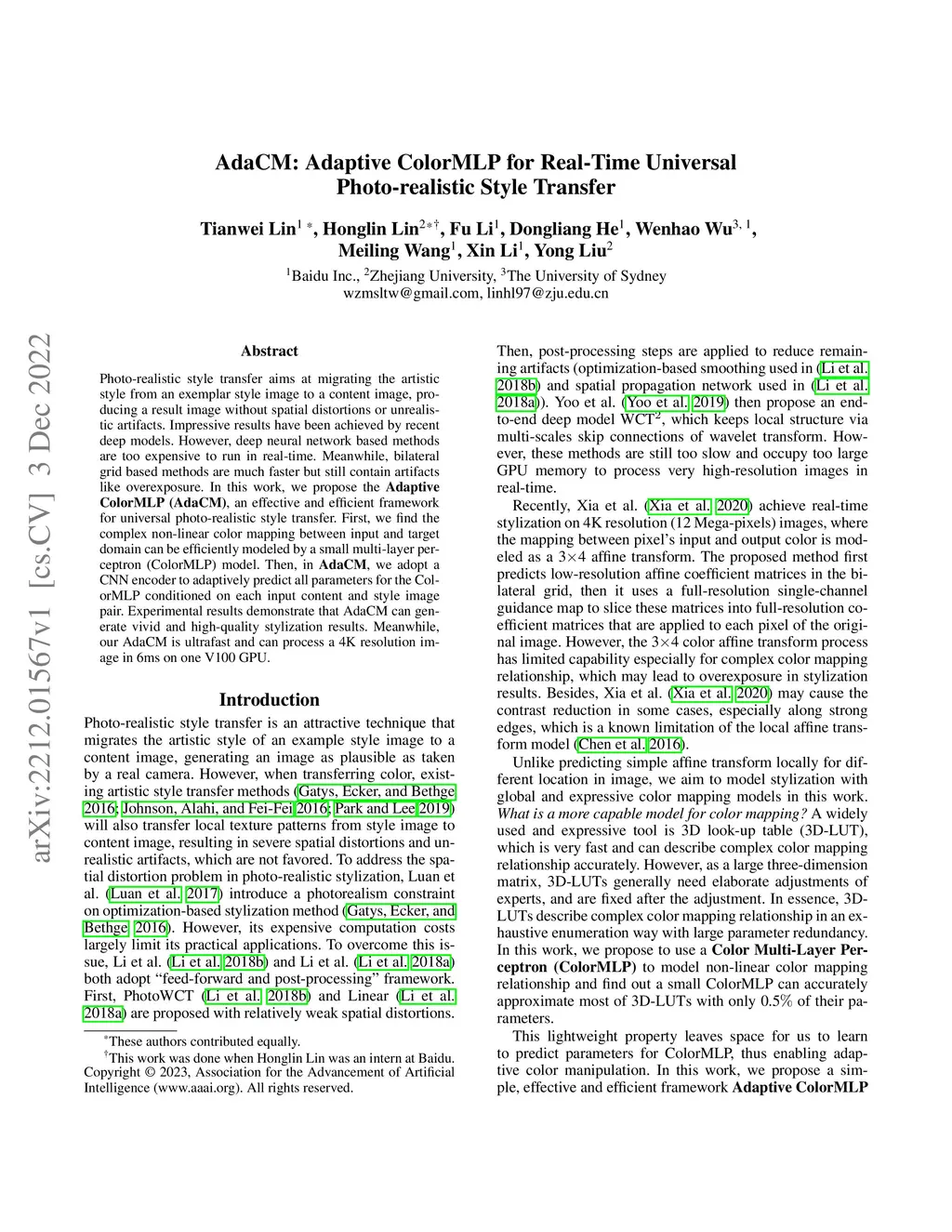 AdaCM: Adaptive ColorMLP for Real-Time Universal Photo-realistic Style