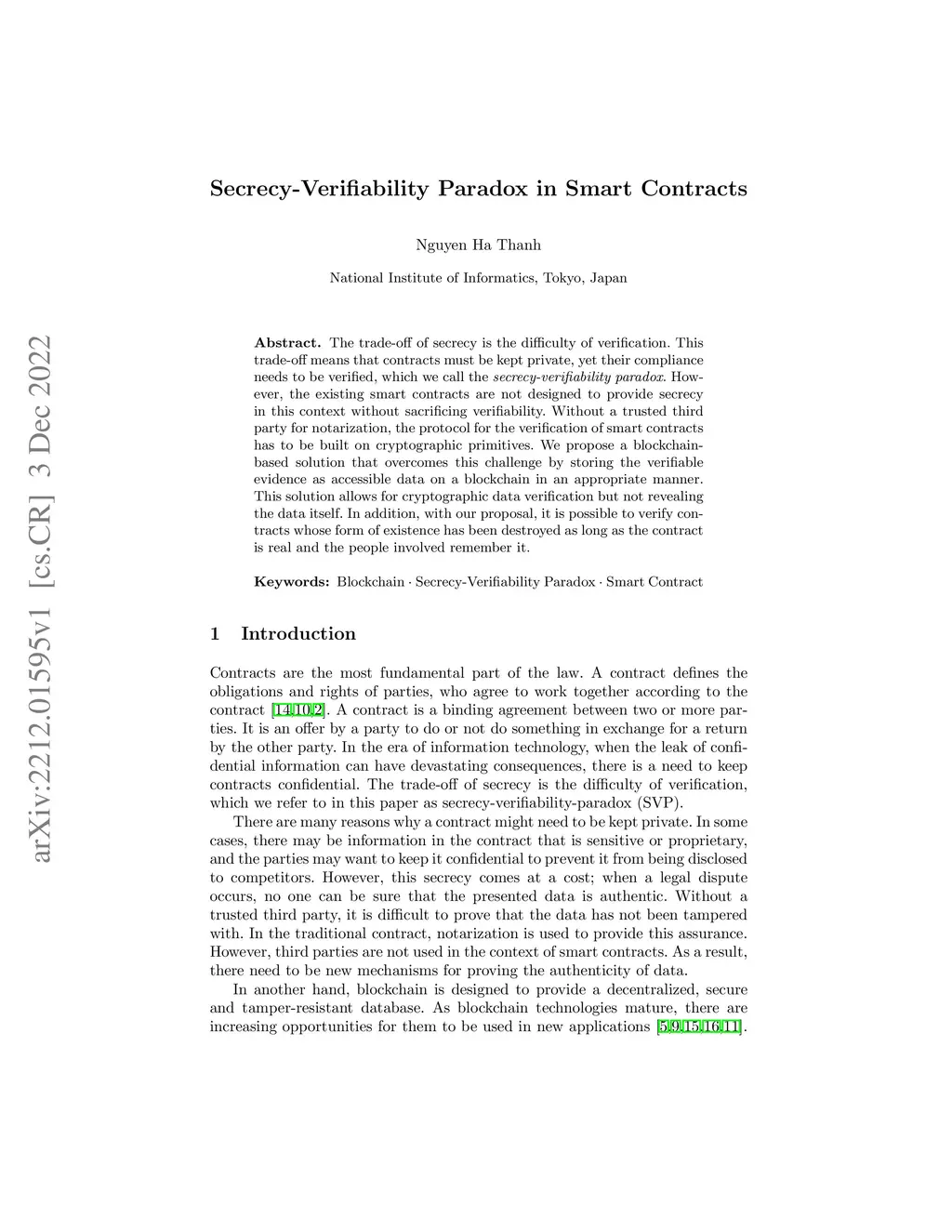 The trade-off of secrecy is the difficulty of verification. This trade-off means that contracts must be kept private, yet their compliance needs to be verified, which we call the secrecy-verifiability paradox. However, the existing smart contracts are not designed to provide secrecy in this context without sacrificing verifiability. Without a trusted third party for notarization, the protocol for the verification of smart contracts has to be built on cryptographic primitives. We propose a blockchain-based solution that overcomes this challenge by storing the verifiable evidence as accessible data on a blockchain in an appropriate manner. This solution allows for cryptographic data verification but not revealing the data itself. In addition, with our proposal, it is possible to verify contracts whose form of existence has been destroyed as long as the contract is real and the people involved remember it.