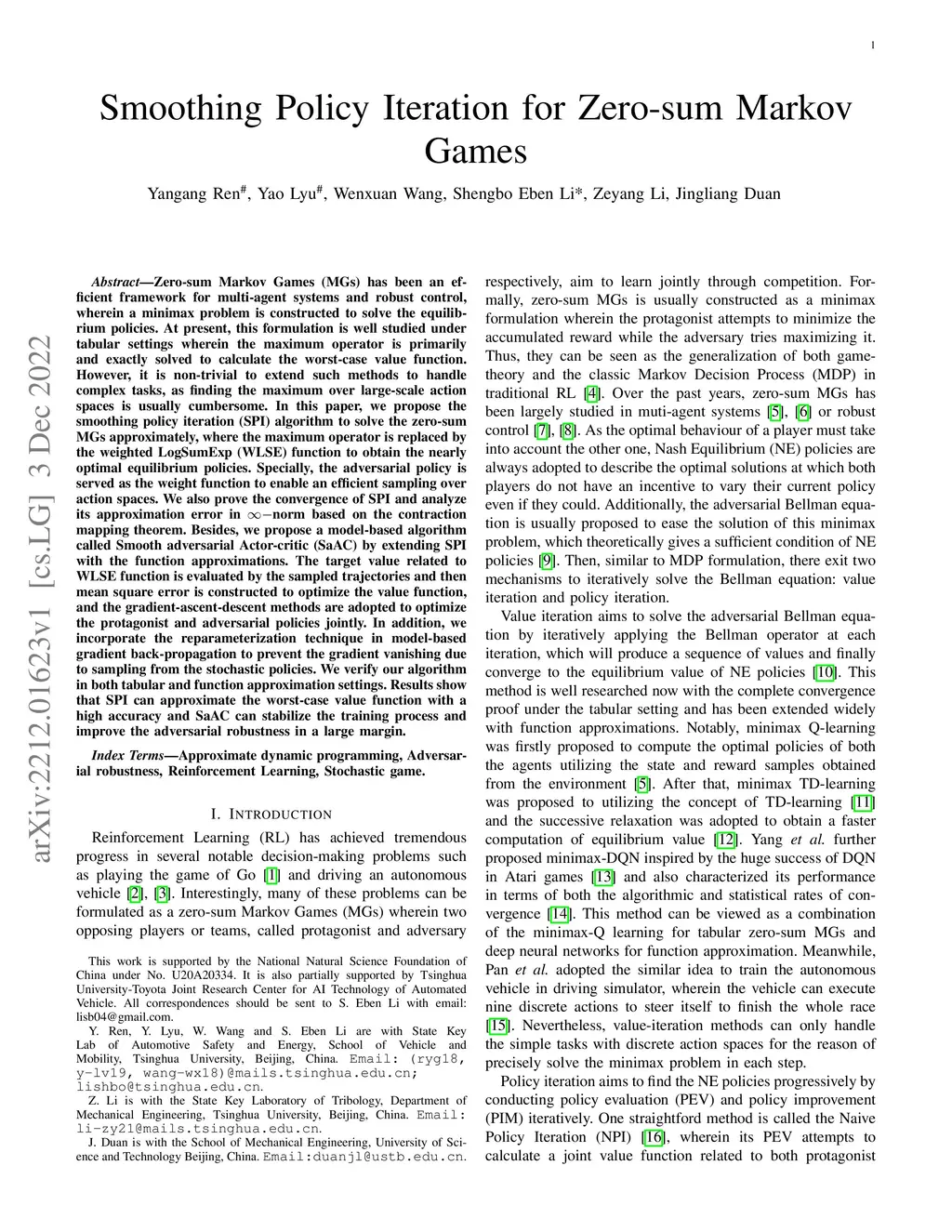 Zero-sum Markov Games (MGs) has been an efficient framework for multi-agent systems and robust control, wherein a minimax problem is constructed to solve the equilibrium policies. At present, this formulation is well studied under tabular settings wherein the maximum operator is primarily and exactly solved to calculate the worst-case value function. However, it is non-trivial to extend such methods to handle complex tasks, as finding the maximum over large-scale action spaces is usually cumbersome. In this paper, we propose the smoothing policy iteration (SPI) algorithm to solve the zero-sum MGs approximately, where the maximum operator is replaced by the weighted LogSumExp (WLSE) function to obtain the nearly optimal equilibrium policies. Specially, the adversarial policy is served as the weight function to enable an efficient sampling over action spaces.We also prove the convergence of SPI and analyze its approximation error in norm based on the contraction mapping theorem. Besides, we propose a model-based algorithm called Smooth adversarial Actor-critic (SaAC) by extending SPI with the function approximations. The target value related to WLSE function is evaluated by the sampled trajectories and then mean square error is constructed to optimize the value function, and the gradient-ascent-descent methods are adopted to optimize the protagonist and adversarial policies jointly. In addition, we incorporate the reparameterization technique in model-based gradient back-propagation to prevent the gradient vanishing due to sampling from the stochastic policies. We verify our algorithm in both tabular and function approximation settings. Results show that SPI can approximate the worst-case value function with a high accuracy and SaAC can stabilize the training process and improve the adversarial robustness in a large margin.