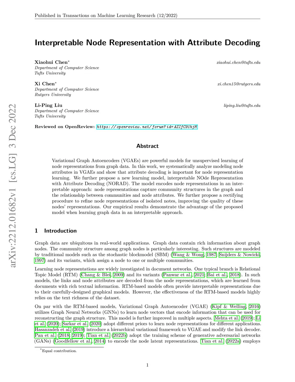 Variational Graph Autoencoders (VGAEs) are powerful models for unsupervised learning of node representations from graph data. In this work, we systematically analyze modeling node attributes in VGAEs and show that attribute decoding is important for node representation learning. We further propose a new learning model, interpretable NOde Representation with Attribute Decoding (NORAD). The model encodes node representations in an interpretable approach: node representations capture community structures in the graph and the relationship between communities and node attributes. We further propose a rectifying procedure to refine node representations of isolated notes, improving the quality of these nodes' representations. Our empirical results demonstrate the advantage of the proposed model when learning graph data in an interpretable approach.
