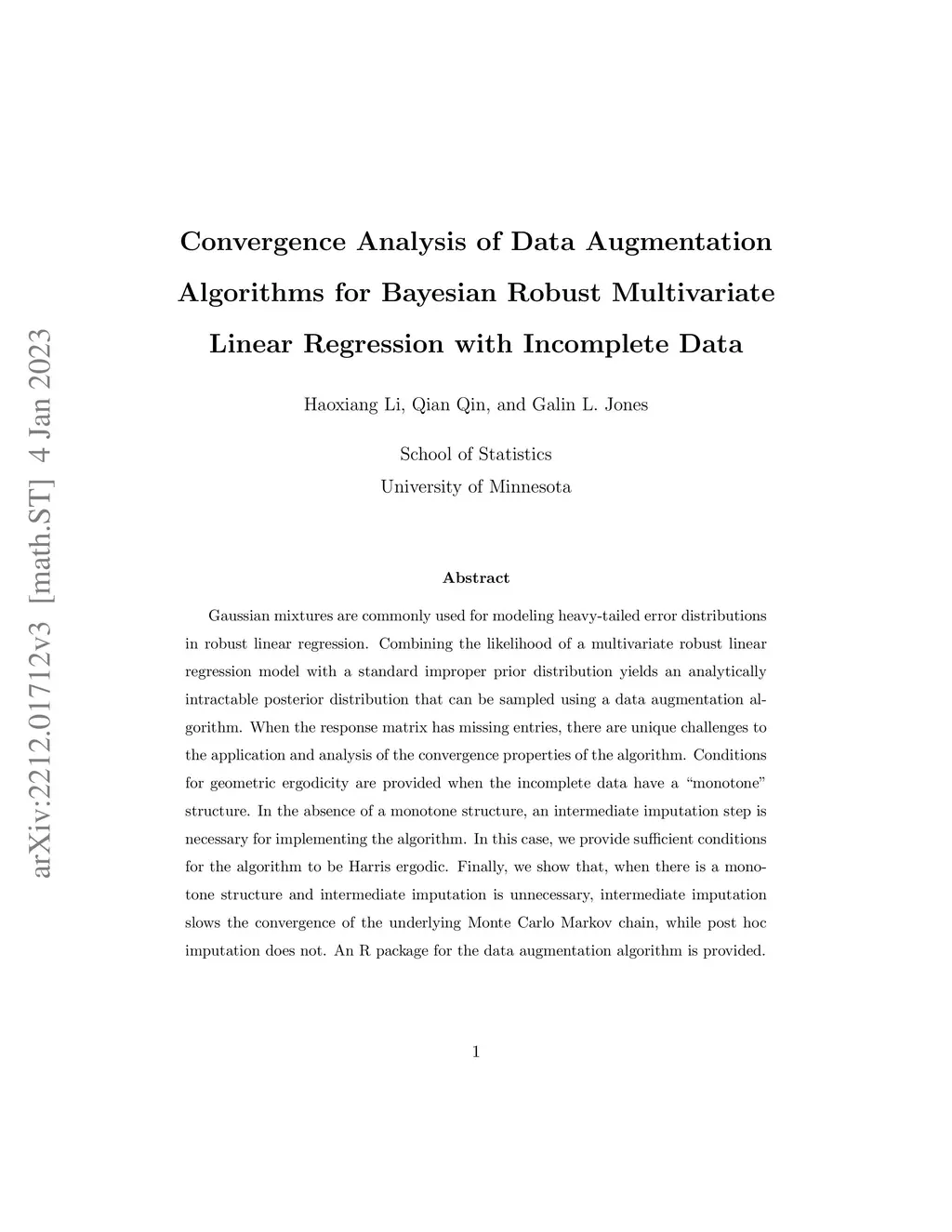 Gaussian mixtures are commonly used for modeling heavy-tailed error distributions in robust linear regression. Combining the likelihood of a multivariate robust linear regression model with a standard improper prior distribution yields an analytically intractable posterior distribution that can be sampled using a data augmentation algorithm. When the response matrix has missing entries, there are unique challenges to the application and analysis of the convergence properties of the algorithm. Conditions for geometric ergodicity are provided when the incomplete data have a "monotone" structure. In the absence of a monotone structure, an intermediate imputation step is necessary for implementing the algorithm. In this case, we provide sufficient conditions for the algorithm to be Harris ergodic. Finally, we show that, when there is a monotone structure and intermediate imputation is unnecessary, intermediate imputation slows the convergence of the underlying Monte Carlo Markov chain, while post hoc imputation does not. An R package for the data augmentation algorithm is provided.