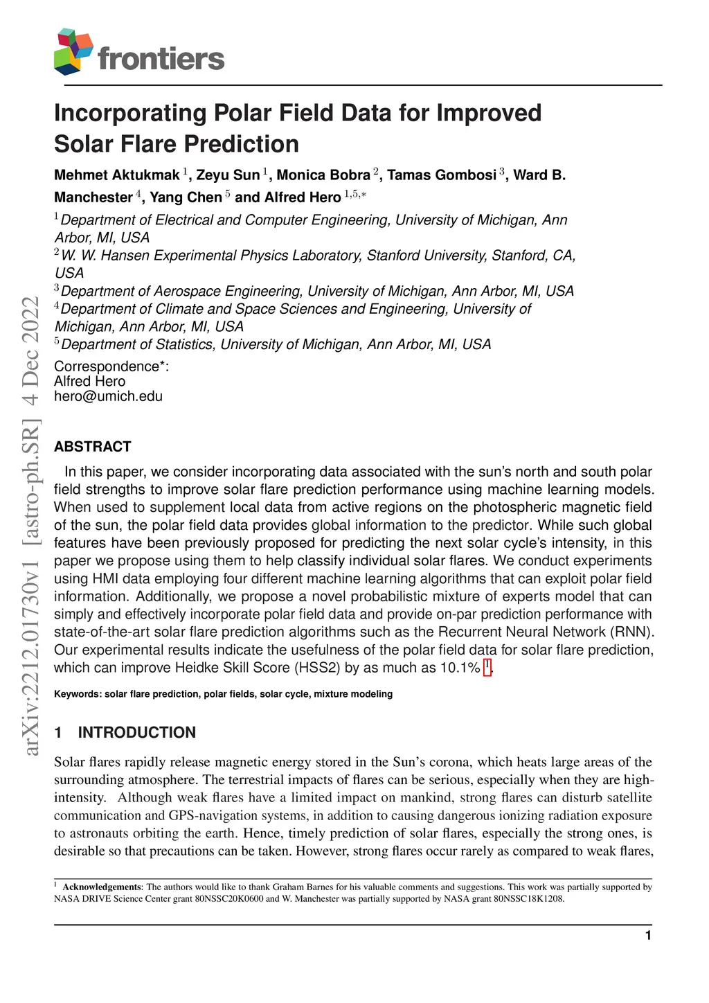 In this paper, we consider incorporating data associated with the sun's north and south polar field strengths to improve solar flare prediction performance using machine learning models. When used to supplement local data from active regions on the photospheric magnetic field of the sun, the polar field data provides global information to the predictor. While such global features have been previously proposed for predicting the next solar cycle's intensity, in this paper we propose using them to help classify individual solar flares. We conduct experiments using HMI data employing four different machine learning algorithms that can exploit polar field information. Additionally, we propose a novel probabilistic mixture of experts model that can simply and effectively incorporate polar field data and provide on-par prediction performance with state-of-the-art solar flare prediction algorithms such as the Recurrent Neural Network (RNN). Our experimental results indicate the usefulness of the polar field data for solar flare prediction, which can improve Heidke Skill Score (HSS2) by as much as 10.1%.