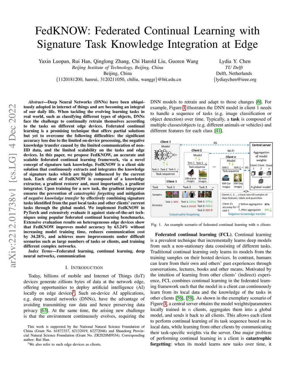 Deep Neural Networks (DNNs) have been ubiquitously adopted in internet of things and are becoming an integral of our daily life. When tackling the evolving learning tasks in real world, such as classifying different types of objects, DNNs face the challenge to continually retrain themselves according to the tasks on different edge devices. Federated continual learning is a promising technique that offers partial solutions but yet to overcome the following difficulties: the significant accuracy loss due to the limited on-device processing, the negative knowledge transfer caused by the limited communication of non-IID data, and the limited scalability on the tasks and edge devices. In this paper, we propose FedKNOW, an accurate and scalable federated continual learning framework, via a novel concept of signature task knowledge. FedKNOW is a client side solution that continuously extracts and integrates the knowledge of signature tasks which are highly influenced by the current task. Each client of FedKNOW is composed of a knowledge extractor, a gradient restorer and, most importantly, a gradient integrator. Upon training for a new task, the gradient integrator ensures the prevention of catastrophic forgetting and mitigation of negative knowledge transfer by effectively combining signature tasks identified from the past local tasks and other clients' current tasks through the global model. We implement FedKNOW in PyTorch and extensively evaluate it against state-of-the-art techniques using popular federated continual learning benchmarks. Extensive evaluation results on heterogeneous edge devices show that FedKNOW improves model accuracy by 63.24% without increasing model training time, reduces communication cost by 34.28%, and achieves more improvements under difficult scenarios such as large numbers of tasks or clients, and training different complex networks.