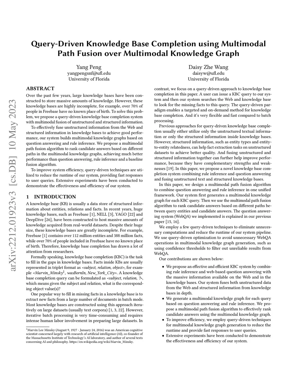 Over the past few years, large knowledge bases have been constructed to store massive amounts of knowledge. However, these knowledge bases are highly incomplete, for example, over 70% of people in Freebase have no known place of birth. To solve this problem, we propose a query-driven knowledge base completion system with multimodal fusion of unstructured and structured information. To effectively fuse unstructured information from the Web and structured information in knowledge bases to achieve good performance, our system builds multimodal knowledge graphs based on question answering and rule inference. We propose a multimodal path fusion algorithm to rank candidate answers based on different paths in the multimodal knowledge graphs, achieving much better performance than question answering, rule inference and a baseline fusion algorithm. To improve system efficiency, query-driven techniques are utilized to reduce the runtime of our system, providing fast responses to user queries. Extensive experiments have been conducted to demonstrate the effectiveness and efficiency of our system.