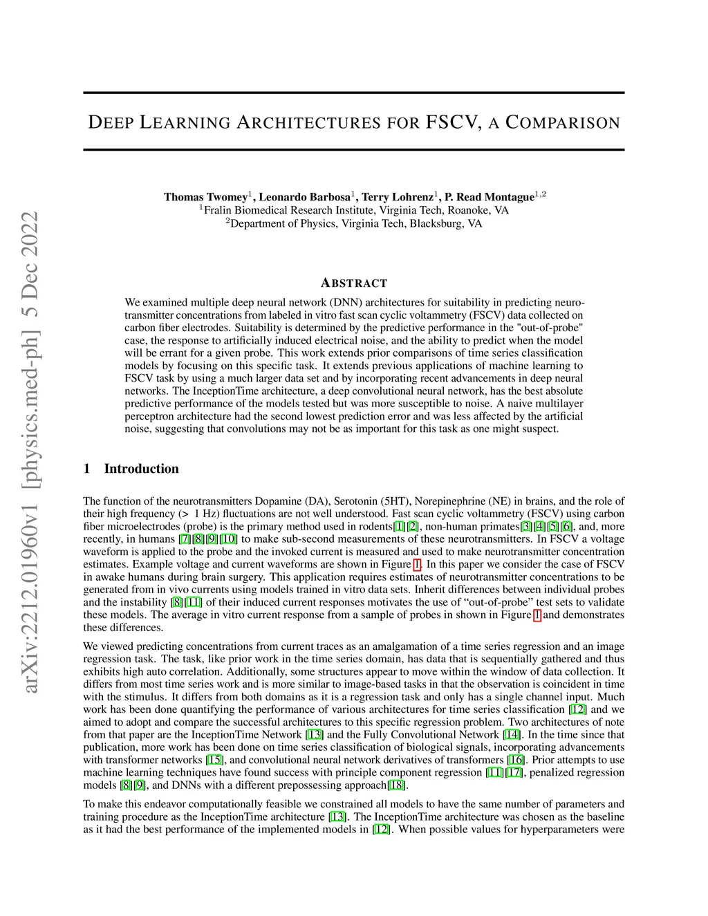 We examined multiple deep neural network (DNN) architectures for suitability in predicting neurotransmitter concentrations from labeled in vitro fast scan cyclic voltammetry (FSCV) data collected on carbon fiber electrodes. Suitability is determined by the predictive performance in the "out-of-probe" case, the response to artificially induced electrical noise, and the ability to predict when the model will be errant for a given probe. This work extends prior comparisons of time series classification models by focusing on this specific task. It extends previous applications of machine learning to FSCV task by using a much larger data set and by incorporating recent advancements in deep neural networks. The InceptionTime architecture, a deep convolutional neural network, has the best absolute predictive performance of the models tested but was more susceptible to noise. A naive multilayer perceptron architecture had the second lowest prediction error and was less affected by the artificial noise, suggesting that convolutions may not be as important for this task as one might suspect.