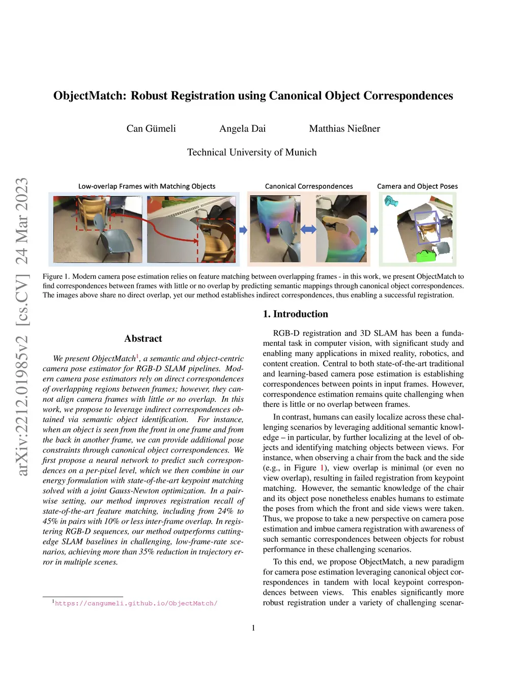 We present ObjectMatch, a semantic and object-centric camera pose estimator for RGB-D SLAM pipelines. Modern camera pose estimators rely on direct correspondences of overlapping regions between frames; however, they cannot align camera frames with little or no overlap. In this work, we propose to leverage indirect correspondences obtained via semantic object identification. For instance, when an object is seen from the front in one frame and from the back in another frame, we can provide additional pose constraints through canonical object correspondences. We first propose a neural network to predict such correspondences on a per-pixel level, which we then combine in our energy formulation with state-of-the-art keypoint matching solved with a joint Gauss-Newton optimization. In a pairwise setting, our method improves registration recall of state-of-the-art feature matching, including from 24% to 45% in pairs with 10% or less inter-frame overlap. In registering RGB-D sequences, our method outperforms cutting-edge SLAM baselines in challenging, low-frame-rate scenarios, achieving more than 35% reduction in trajectory error in multiple scenes.
