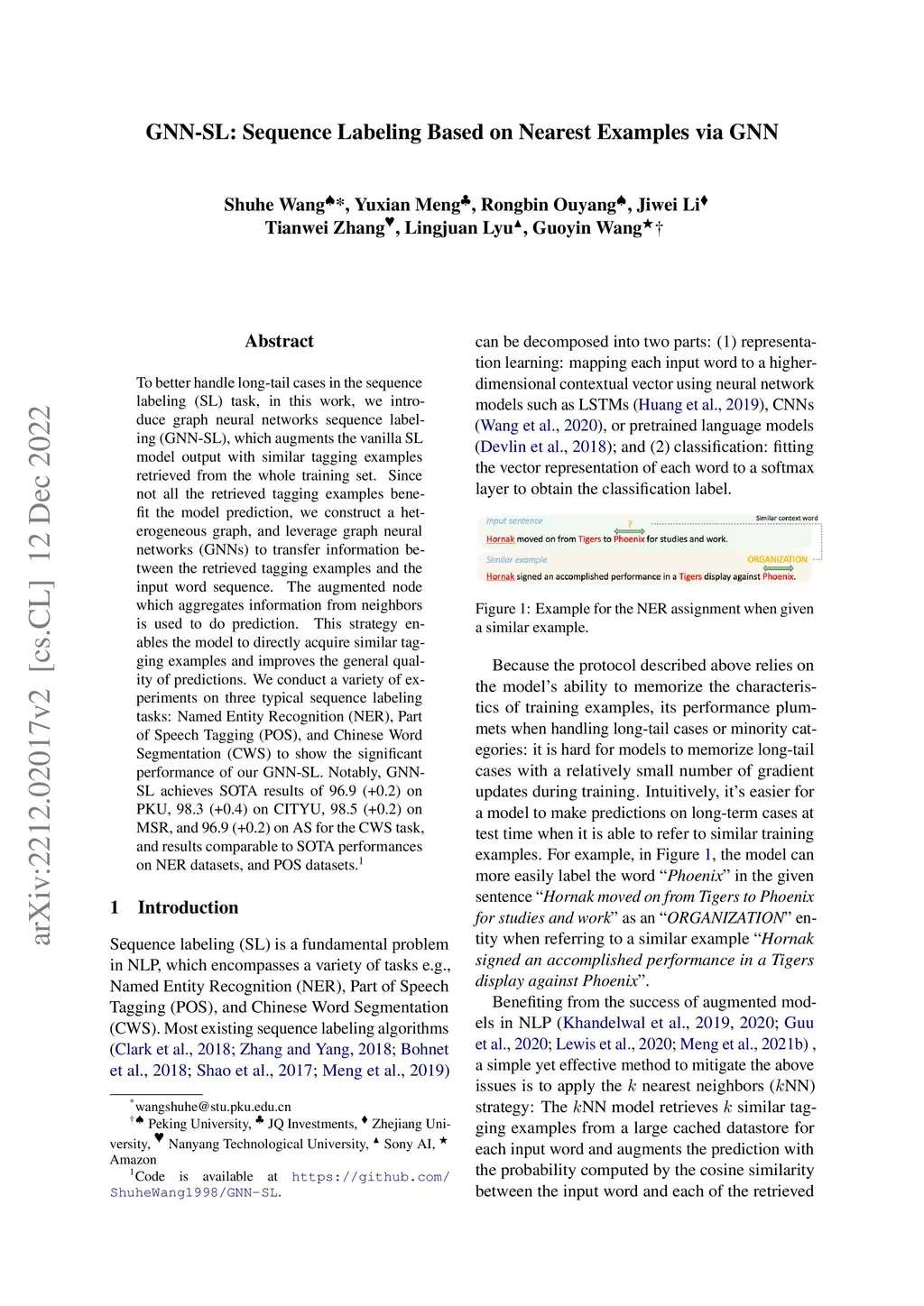 GNN-SL: Sequence Labeling Based on Nearest Examples via GNN