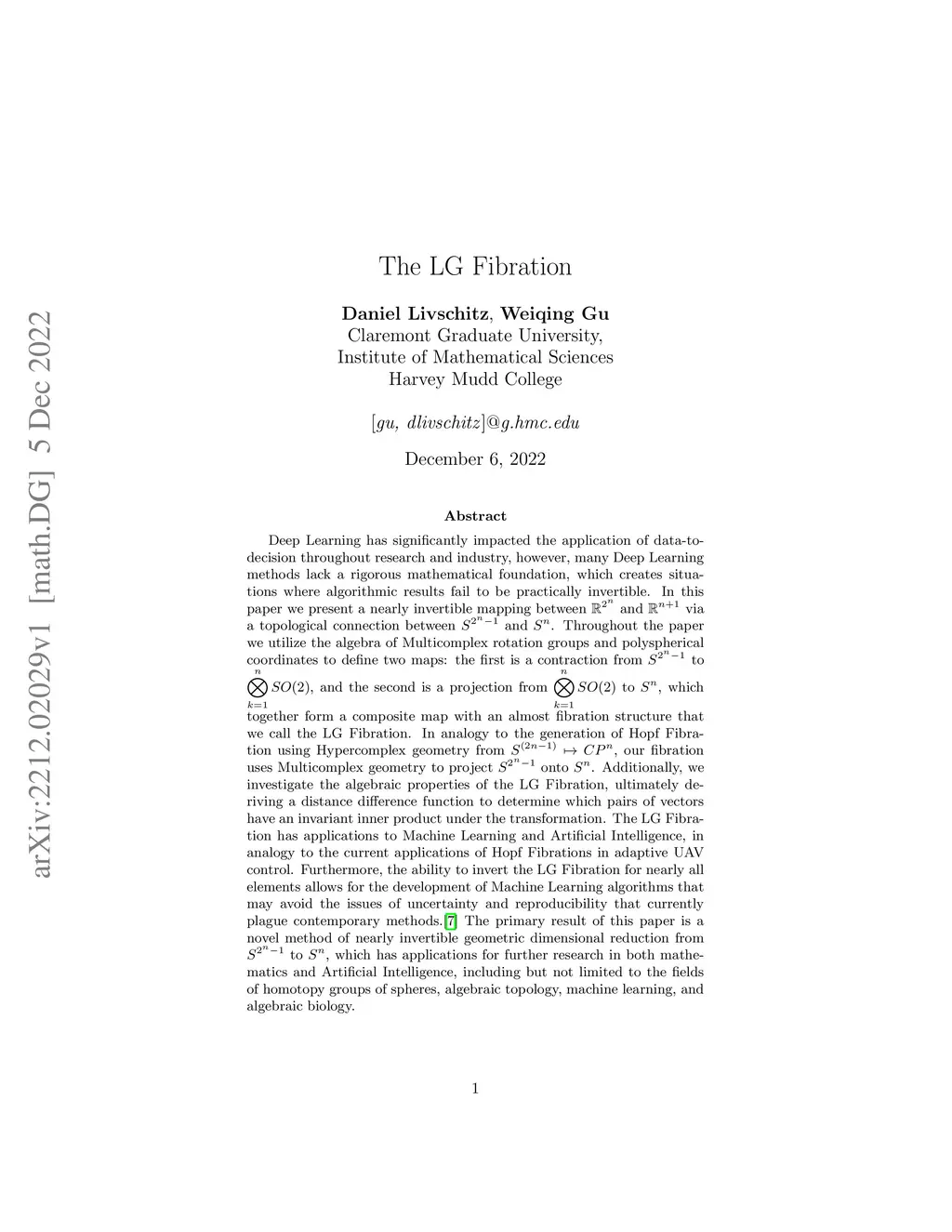 Deep Learning has significantly impacted the application of data-to-decision throughout research and industry, however, they lack a rigorous mathematical foundation, which creates situations where algorithmic results fail to be practically invertible. In this paper we present a nearly invertible mapping between and via a topological connection between and . Throughout the paper we utilize the algebra of Multicomplex rotation groups and polyspherical coordinates to define two maps: the first is a contraction from to , and the second is a projection from to . Together these form a composite map that we call the LG Fibration. In analogy to the generation of Hopf Fibration using Hypercomplex geometry from , our fibration uses Multicomplex geometry to project onto . We also investigate the algebraic properties of the LG Fibration, ultimately deriving a distance difference function to determine which pairs of vectors have an invariant inner product under the transformation. The LG Fibration has applications to Machine Learning and AI, in analogy to the current applications of Hopf Fibrations in adaptive UAV control. Furthermore, the ability to invert the LG Fibration for nearly all elements allows for the development of Machine Learning algorithms that may avoid the issues of uncertainty and reproducibility that currently plague contemporary methods. The primary result of this paper is a novel method of nearly invertible geometric dimensional reduction from to , which has the capability to extend the research in both mathematics and AI, including but not limited to the fields of homotopy groups of spheres, algebraic topology, machine learning, and algebraic biology.