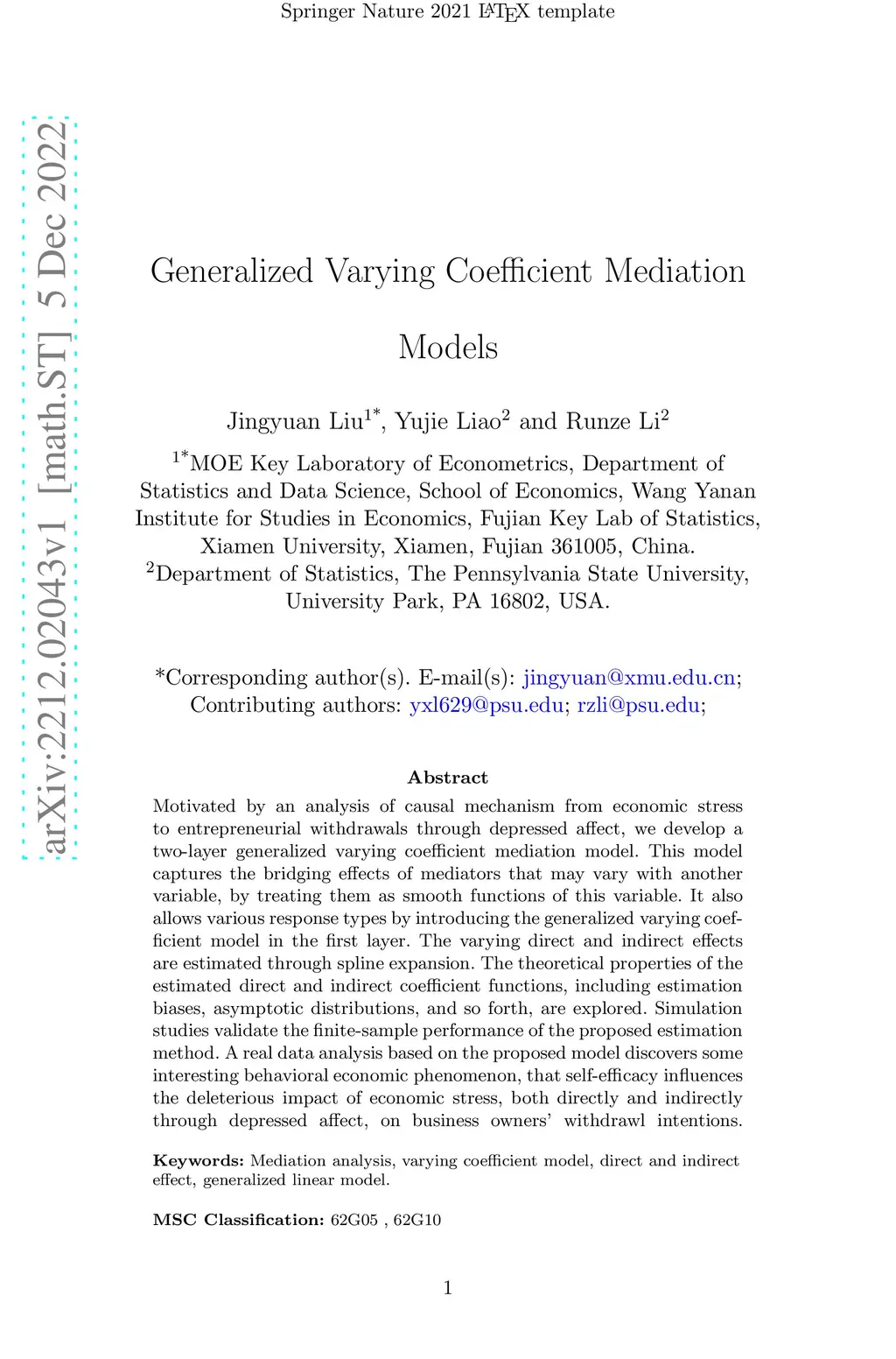 Motivated by an analysis of causal mechanism from economic stress to entrepreneurial withdrawals through depressed affect, we develop a two-layer generalized varying coefficient mediation model. This model captures the bridging effects of mediators that may vary with another variable, by treating them as smooth functions of this variable. It also allows various response types by introducing the generalized varying coefficient model in the first layer. The varying direct and indirect effects are estimated through spline expansion. The theoretical properties of the estimated direct and indirect coefficient functions, including estimation biases, asymptotic distributions, and so forth, are explored. Simulation studies validate the finite-sample performance of the proposed estimation method. A real data analysis based on the proposed model discovers some interesting behavioral economic phenomenon, that self-efficacy influences the deleterious impact of economic stress, both directly and indirectly through depressed affect, on business owners' withdrawl intentions.