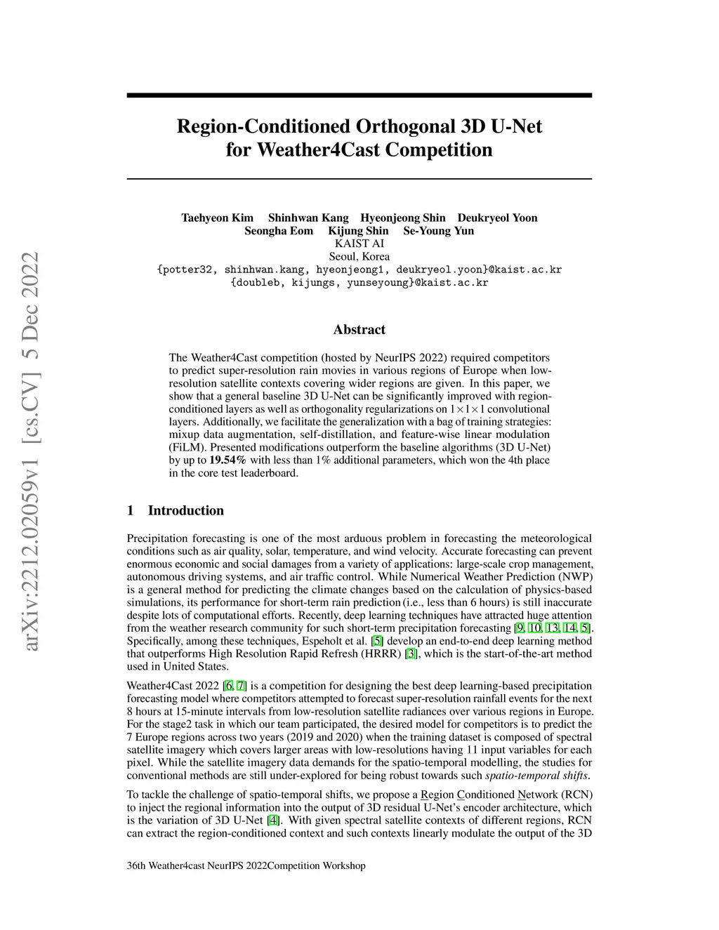 The Weather4Cast competition (hosted by NeurIPS 2022) required competitors to predict super-resolution rain movies in various regions of Europe when low-resolution satellite contexts covering wider regions are given. In this paper, we show that a general baseline 3D U-Net can be significantly improved with region-conditioned layers as well as orthogonality regularizations on 1x1x1 convolutional layers. Additionally, we facilitate the generalization with a bag of training strategies: mixup data augmentation, self-distillation, and feature-wise linear modulation (FiLM). Presented modifications outperform the baseline algorithms (3D U-Net) by up to 19.54% with less than 1% additional parameters, which won the 4th place in the core test leaderboard.