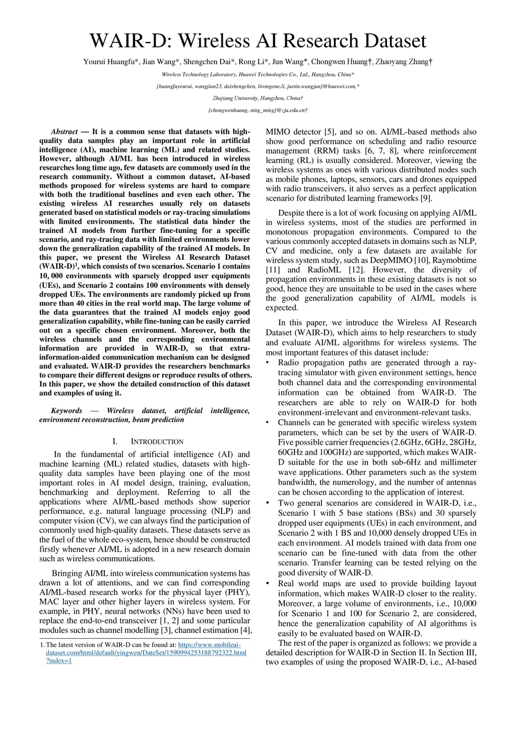 It is a common sense that datasets with high-quality data samples play an important role in artificial intelligence (AI), machine learning (ML) and related studies. However, although AI/ML has been introduced in wireless researches long time ago, few datasets are commonly used in the research community. Without a common dataset, AI-based methods proposed for wireless systems are hard to compare with both the traditional baselines and even each other. The existing wireless AI researches usually rely on datasets generated based on statistical models or ray-tracing simulations with limited environments. The statistical data hinder the trained AI models from further fine-tuning for a specific scenario, and ray-tracing data with limited environments lower down the generalization capability of the trained AI models. In this paper, we present the Wireless AI Research Dataset (WAIR-D)1, which consists of two scenarios. Scenario 1 contains 10,000 environments with sparsely dropped user equipments (UEs), and Scenario 2 contains 100 environments with densely dropped UEs. The environments are randomly picked up from more than 40 cities in the real world map. The large volume of the data guarantees that the trained AI models enjoy good generalization capability, while fine-tuning can be easily carried out on a specific chosen environment. Moreover, both the wireless channels and the corresponding environmental information are provided in WAIR-D, so that extra-information-aided communication mechanism can be designed and evaluated. WAIR-D provides the researchers benchmarks to compare their different designs or reproduce results of others. In this paper, we show the detailed construction of this dataset and examples of using it.