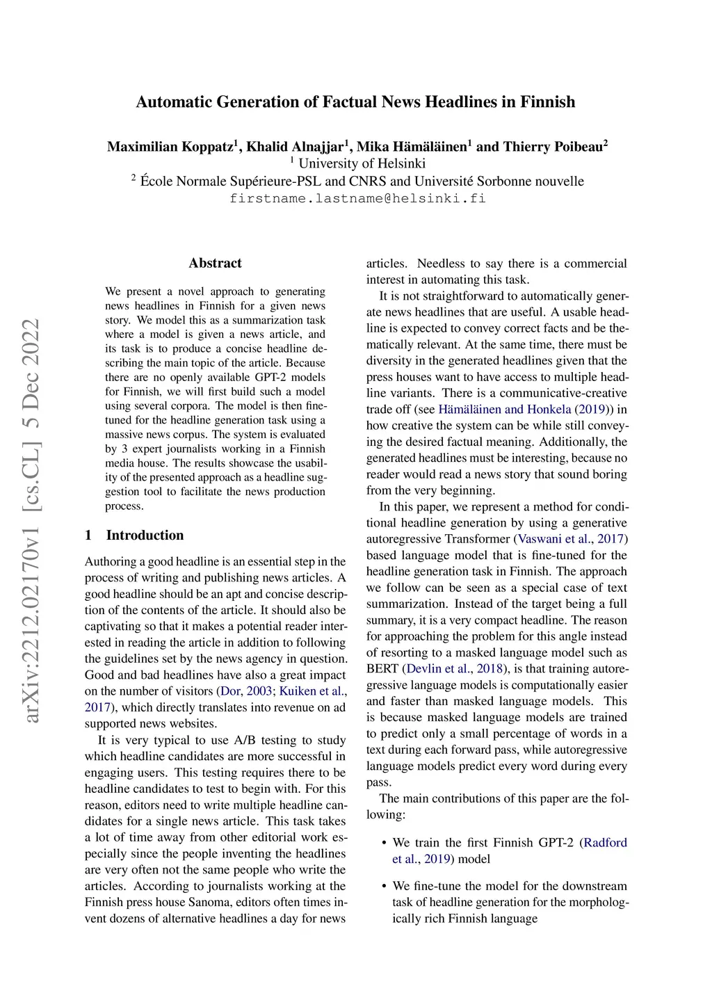 We present a novel approach to generating news headlines in Finnish for a given news story. We model this as a summarization task where a model is given a news article, and its task is to produce a concise headline describing the main topic of the article. Because there are no openly available GPT-2 models for Finnish, we will first build such a model using several corpora. The model is then fine-tuned for the headline generation task using a massive news corpus. The system is evaluated by 3 expert journalists working in a Finnish media house. The results showcase the usability of the presented approach as a headline suggestion tool to facilitate the news production process.