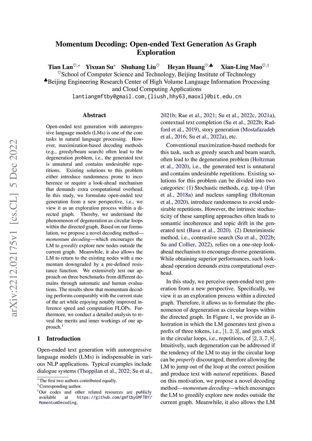 Open-ended text generation with autoregressive language models (LMs) is one of the core tasks in natural language processing. However, maximization-based decoding methods (e.g., greedy/beam search) often lead to the degeneration problem, i.e., the generated text is unnatural and contains undesirable repetitions. Existing solutions to this problem either introduce randomness prone to incoherence or require a look-ahead mechanism that demands extra computational overhead. In this study, we formulate open-ended text generation from a new perspective, i.e., we view it as an exploration process within a directed graph. Thereby, we understand the phenomenon of degeneration as circular loops within the directed graph. Based on our formulation, we propose a novel decoding method -- \textit{momentum decoding} -- which encourages the LM to \textit{greedily} explore new nodes outside the current graph. Meanwhile, it also allows the LM to return to the existing nodes with a momentum downgraded by a pre-defined resistance function. We extensively test our approach on three benchmarks from different domains through automatic and human evaluations. The results show that momentum decoding performs comparably with the current state of the art while enjoying notably improved inference speed and computation FLOPs. Furthermore, we conduct a detailed analysis to reveal the merits and inner workings of our approach. Our codes and other related resources are publicly available at https://github.com/gmftbyGMFTBY/MomentumDecoding.