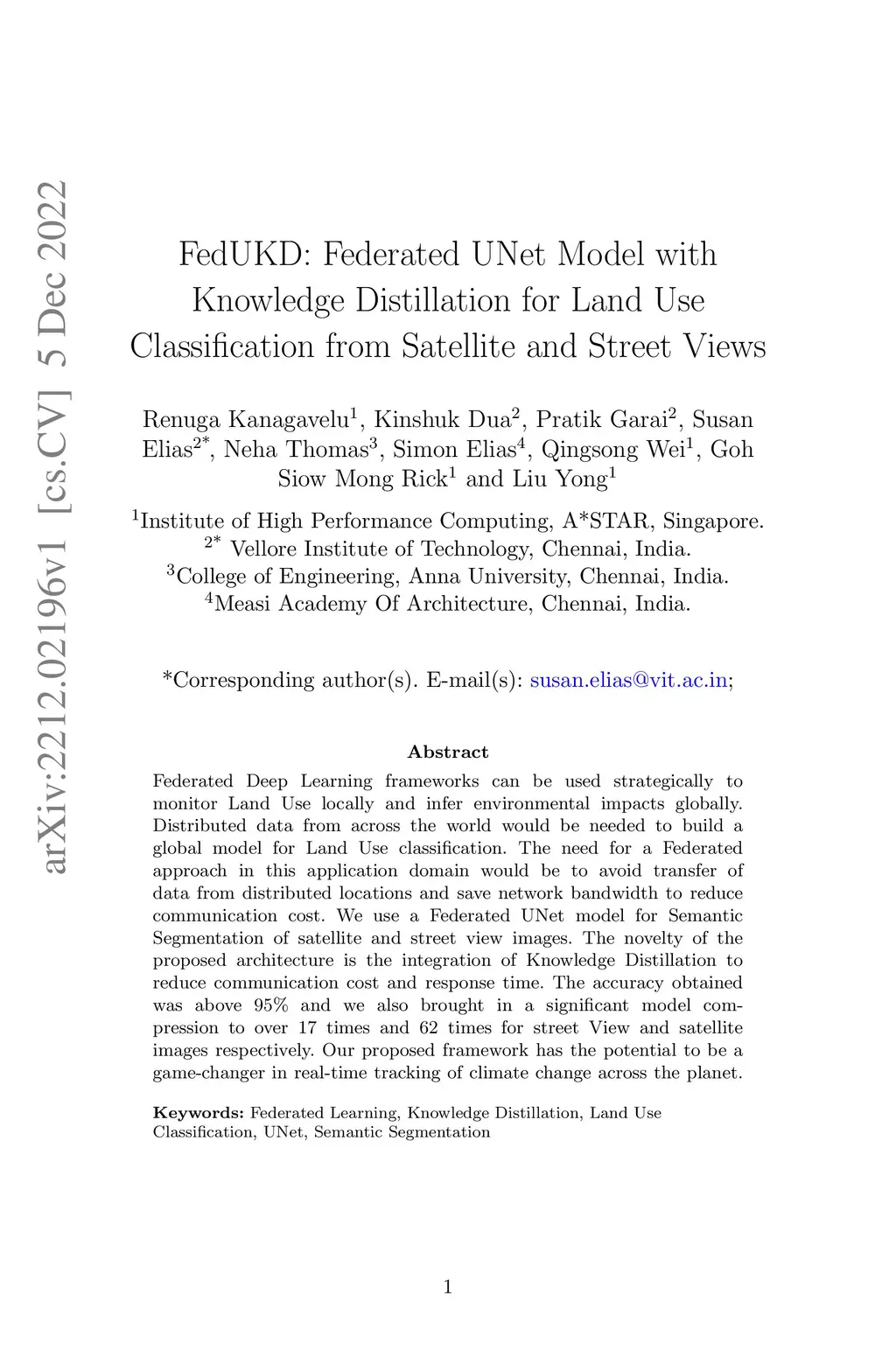 Federated Deep Learning frameworks can be used strategically to monitor Land Use locally and infer environmental impacts globally. Distributed data from across the world would be needed to build a global model for Land Use classification. The need for a Federated approach in this application domain would be to avoid transfer of data from distributed locations and save network bandwidth to reduce communication cost. We use a Federated UNet model for Semantic Segmentation of satellite and street view images. The novelty of the proposed architecture is the integration of Knowledge Distillation to reduce communication cost and response time. The accuracy obtained was above 95% and we also brought in a significant model compression to over 17 times and 62 times for street View and satellite images respectively. Our proposed framework has the potential to be a game-changer in real-time tracking of climate change across the planet.