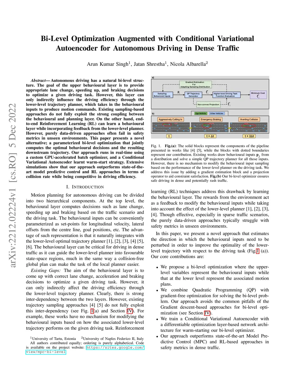 Autonomous driving has a natural bi-level structure. The goal of the upper behavioural layer is to provide appropriate lane change, speeding up, and braking decisions to optimize a given driving task. However, this layer can only indirectly influence the driving efficiency through the lower-level trajectory planner, which takes in the behavioural inputs to produce motion commands. Existing sampling-based approaches do not fully exploit the strong coupling between the behavioural and planning layer. On the other hand, end-to-end Reinforcement Learning (RL) can learn a behavioural layer while incorporating feedback from the lower-level planner. However, purely data-driven approaches often fail in safety metrics in unseen environments. This paper presents a novel alternative; a parameterized bi-level optimization that jointly computes the optimal behavioural decisions and the resulting downstream trajectory. Our approach runs in real-time using a custom GPU-accelerated batch optimizer, and a Conditional Variational Autoencoder learnt warm-start strategy. Extensive simulations show that our approach outperforms state-of-the-art model predictive control and RL approaches in terms of collision rate while being competitive in driving efficiency.