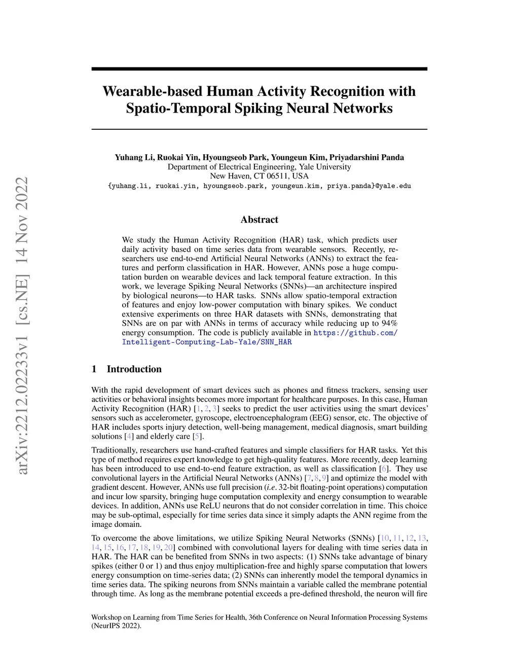 We study the Human Activity Recognition (HAR) task, which predicts user daily activity based on time series data from wearable sensors. Recently, researchers use end-to-end Artificial Neural Networks (ANNs) to extract the features and perform classification in HAR. However, ANNs pose a huge computation burden on wearable devices and lack temporal feature extraction. In this work, we leverage Spiking Neural Networks (SNNs)--an architecture inspired by biological neurons--to HAR tasks. SNNs allow spatio-temporal extraction of features and enjoy low-power computation with binary spikes. We conduct extensive experiments on three HAR datasets with SNNs, demonstrating that SNNs are on par with ANNs in terms of accuracy while reducing up to 94% energy consumption. The code is publicly available in https://github.com/Intelligent-Computing-Lab-Yale/SNN_HAR