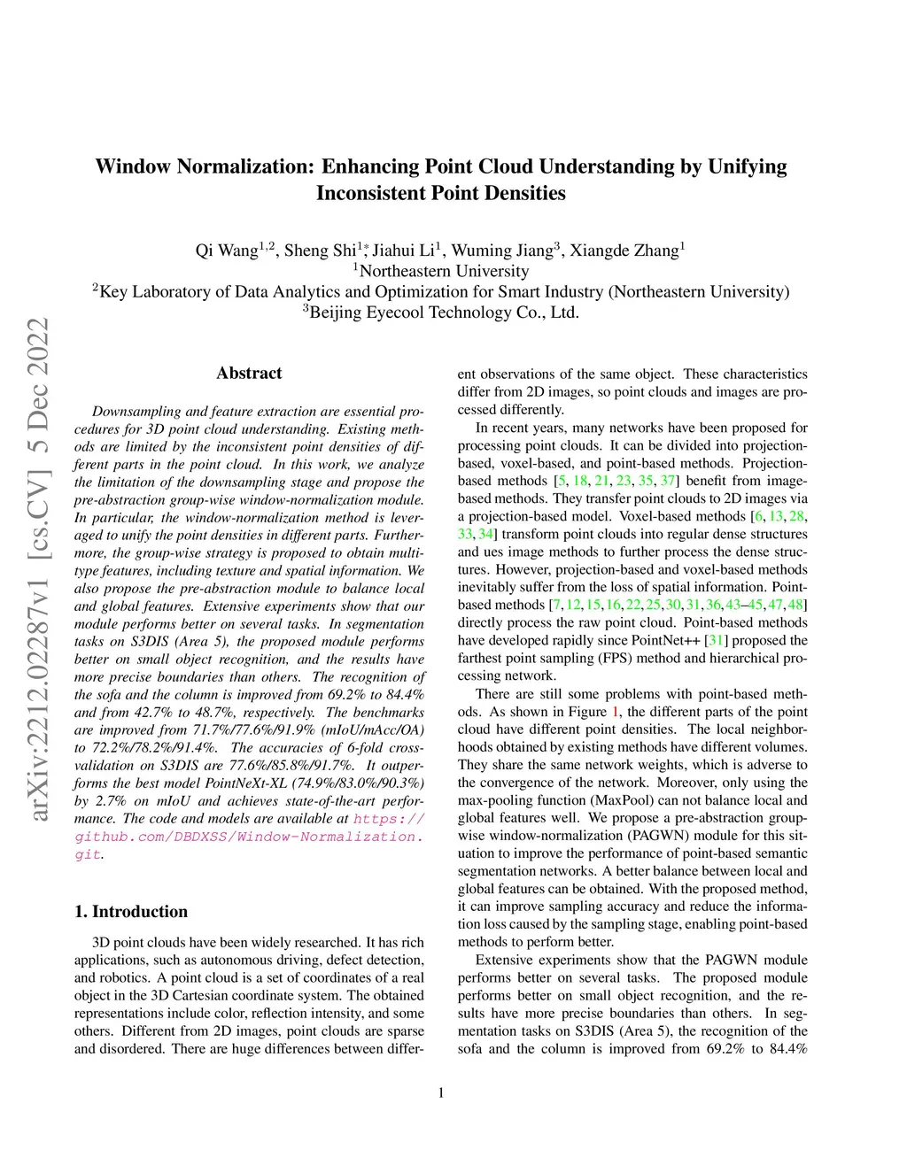 Downsampling and feature extraction are essential procedures for 3D point cloud understanding. Existing methods are limited by the inconsistent point densities of different parts in the point cloud. In this work, we analyze the limitation of the downsampling stage and propose the pre-abstraction group-wise window-normalization module. In particular, the window-normalization method is leveraged to unify the point densities in different parts. Furthermore, the group-wise strategy is proposed to obtain multi-type features, including texture and spatial information. We also propose the pre-abstraction module to balance local and global features. Extensive experiments show that our module performs better on several tasks. In segmentation tasks on S3DIS (Area 5), the proposed module performs better on small object recognition, and the results have more precise boundaries than others. The recognition of the sofa and the column is improved from 69.2% to 84.4% and from 42.7% to 48.7%, respectively. The benchmarks are improved from 71.7%/77.6%/91.9% (mIoU/mAcc/OA) to 72.2%/78.2%/91.4%. The accuracies of 6-fold cross-validation on S3DIS are 77.6%/85.8%/91.7%. It outperforms the best model PointNeXt-XL (74.9%/83.0%/90.3%) by 2.7% on mIoU and achieves state-of-the-art performance. The code and models are available at https://github.com/DBDXSS/Window-Normalization.git.