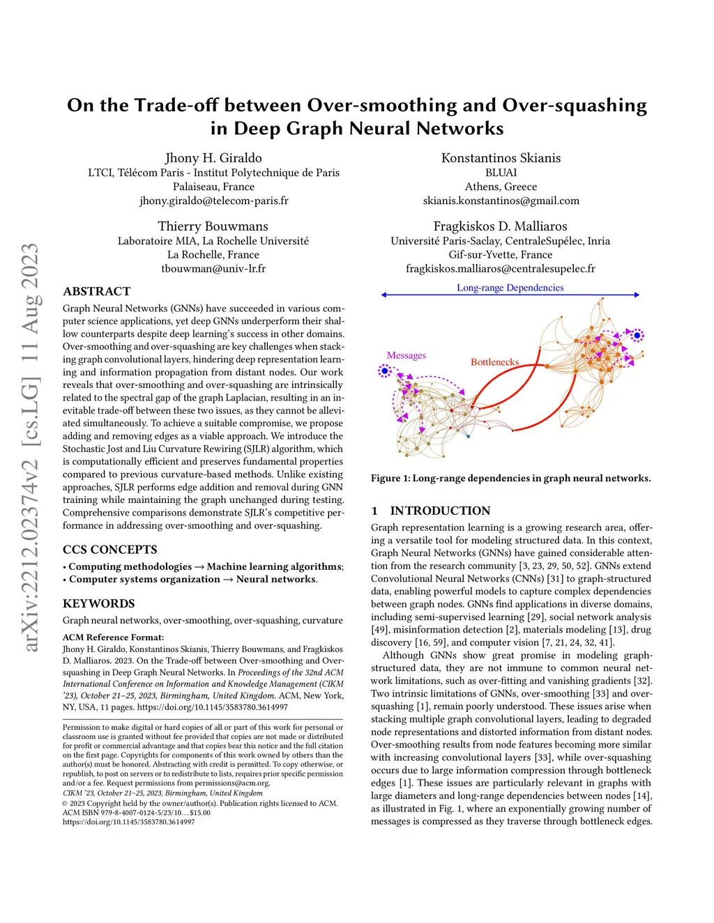 Graph Neural Networks (GNNs) have succeeded in various computer science applications, yet deep GNNs underperform their shallow counterparts despite deep learning's success in other domains. Over-smoothing and over-squashing are key challenges when stacking graph convolutional layers, hindering deep representation learning and information propagation from distant nodes. Our work reveals that over-smoothing and over-squashing are intrinsically related to the spectral gap of the graph Laplacian, resulting in an inevitable trade-off between these two issues, as they cannot be alleviated simultaneously. To achieve a suitable compromise, we propose adding and removing edges as a viable approach. We introduce the Stochastic Jost and Liu Curvature Rewiring (SJLR) algorithm, which is computationally efficient and preserves fundamental properties compared to previous curvature-based methods. Unlike existing approaches, SJLR performs edge addition and removal during GNN training while maintaining the graph unchanged during testing. Comprehensive comparisons demonstrate SJLR's competitive performance in addressing over-smoothing and over-squashing.