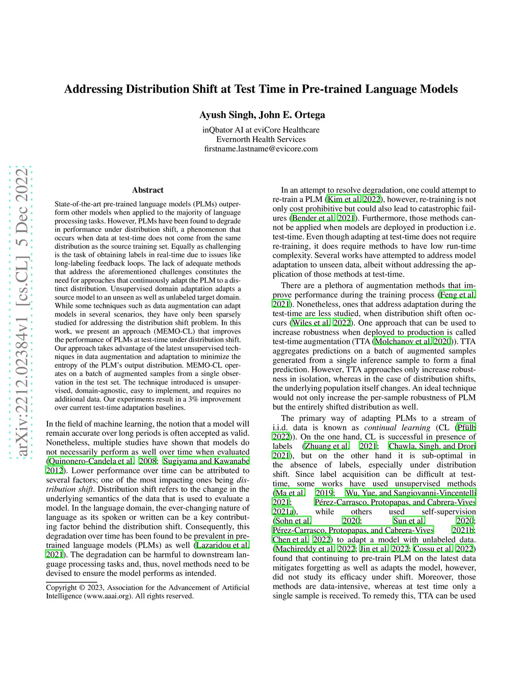 State-of-the-art pre-trained language models (PLMs) outperform other models when applied to the majority of language processing tasks. However, PLMs have been found to degrade in performance under distribution shift, a phenomenon that occurs when data at test-time does not come from the same distribution as the source training set. Equally as challenging is the task of obtaining labels in real-time due to issues like long-labeling feedback loops. The lack of adequate methods that address the aforementioned challenges constitutes the need for approaches that continuously adapt the PLM to a distinct distribution. Unsupervised domain adaptation adapts a source model to an unseen as well as unlabeled target domain. While some techniques such as data augmentation can adapt models in several scenarios, they have only been sparsely studied for addressing the distribution shift problem. In this work, we present an approach (MEMO-CL) that improves the performance of PLMs at test-time under distribution shift. Our approach takes advantage of the latest unsupervised techniques in data augmentation and adaptation to minimize the entropy of the PLM's output distribution. MEMO-CL operates on a batch of augmented samples from a single observation in the test set. The technique introduced is unsupervised, domain-agnostic, easy to implement, and requires no additional data. Our experiments result in a 3% improvement over current test-time adaptation baselines.