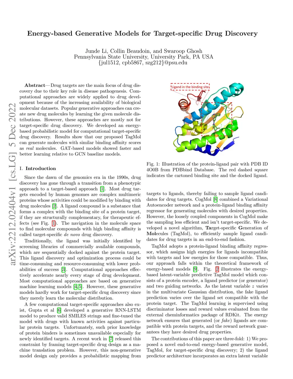 Drug targets are the main focus of drug discovery due to their key role in disease pathogenesis. Computational approaches are widely applied to drug development because of the increasing availability of biological molecular datasets. Popular generative approaches can create new drug molecules by learning the given molecule distributions. However, these approaches are mostly not for target-specific drug discovery. We developed an energy-based probabilistic model for computational target-specific drug discovery. Results show that our proposed TagMol can generate molecules with similar binding affinity scores as real molecules. GAT-based models showed faster and better learning relative to GCN baseline models.