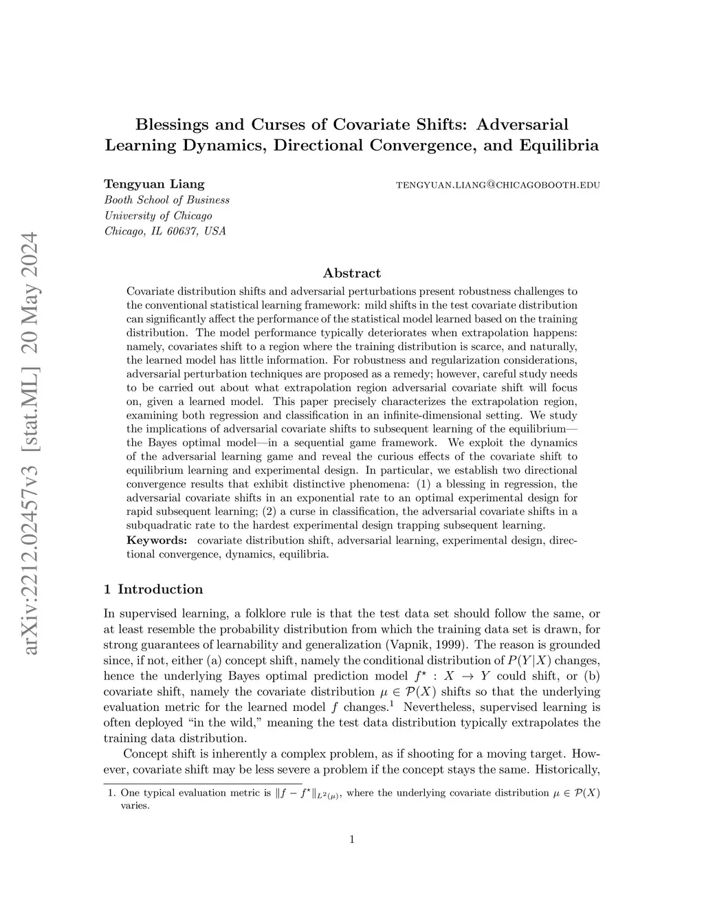 Covariate distribution shifts and adversarial perturbations present robustness challenges to the conventional statistical learning framework: mild shifts in the test covariate distribution can significantly affect the performance of the statistical model learned based on the training distribution. The model performance typically deteriorates when extrapolation happens: namely, covariates shift to a region where the training distribution is scarce, and naturally, the learned model has little information. For robustness and regularization considerations, adversarial perturbation techniques are proposed as a remedy; however, careful study needs to be carried out about what extrapolation region adversarial covariate shift will focus on, given a learned model. This paper precisely characterizes the extrapolation region, examining both regression and classification in an infinite-dimensional setting. We study the implications of adversarial covariate shifts to subsequent learning of the equilibrium -- the Bayes optimal model -- in a sequential game framework. We exploit the dynamics of the adversarial learning game and reveal the curious effects of the covariate shift to equilibrium learning and experimental design. In particular, we establish two directional convergence results that exhibit distinctive phenomena: (1) a blessing in regression, the adversarial covariate shifts in an exponential rate to an optimal experimental design for rapid subsequent learning; (2) a curse in classification, the adversarial covariate shifts in a subquadratic rate to the hardest experimental design trapping subsequent learning.