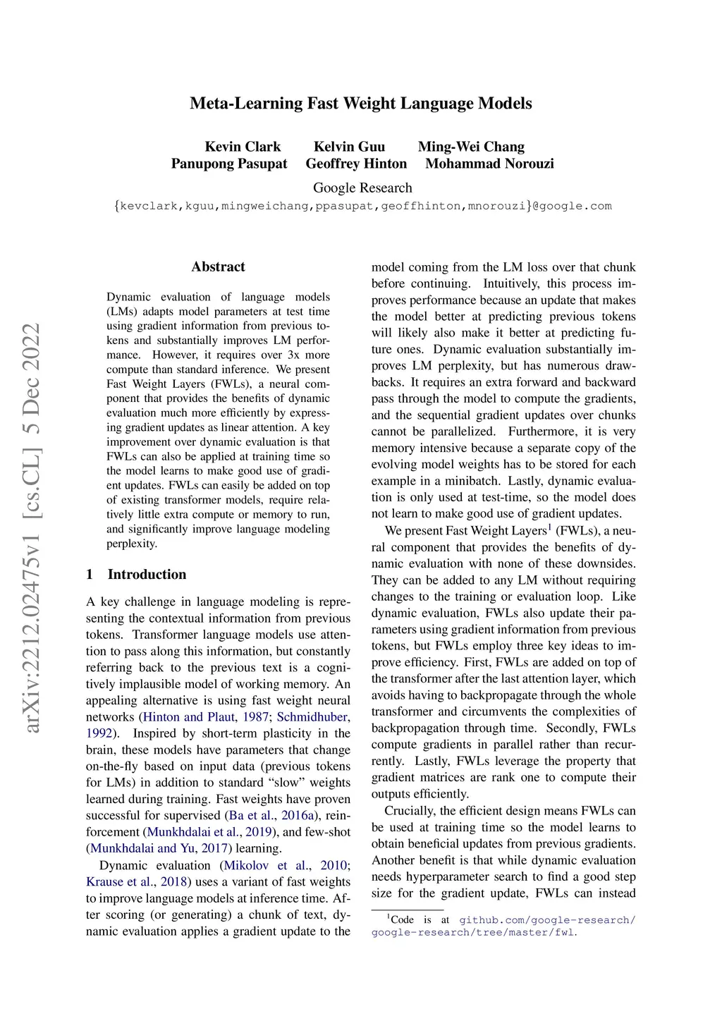 Dynamic evaluation of language models (LMs) adapts model parameters at test time using gradient information from previous tokens and substantially improves LM performance. However, it requires over 3x more compute than standard inference. We present Fast Weight Layers (FWLs), a neural component that provides the benefits of dynamic evaluation much more efficiently by expressing gradient updates as linear attention. A key improvement over dynamic evaluation is that FWLs can also be applied at training time so the model learns to make good use of gradient updates. FWLs can easily be added on top of existing transformer models, require relatively little extra compute or memory to run, and significantly improve language modeling perplexity.