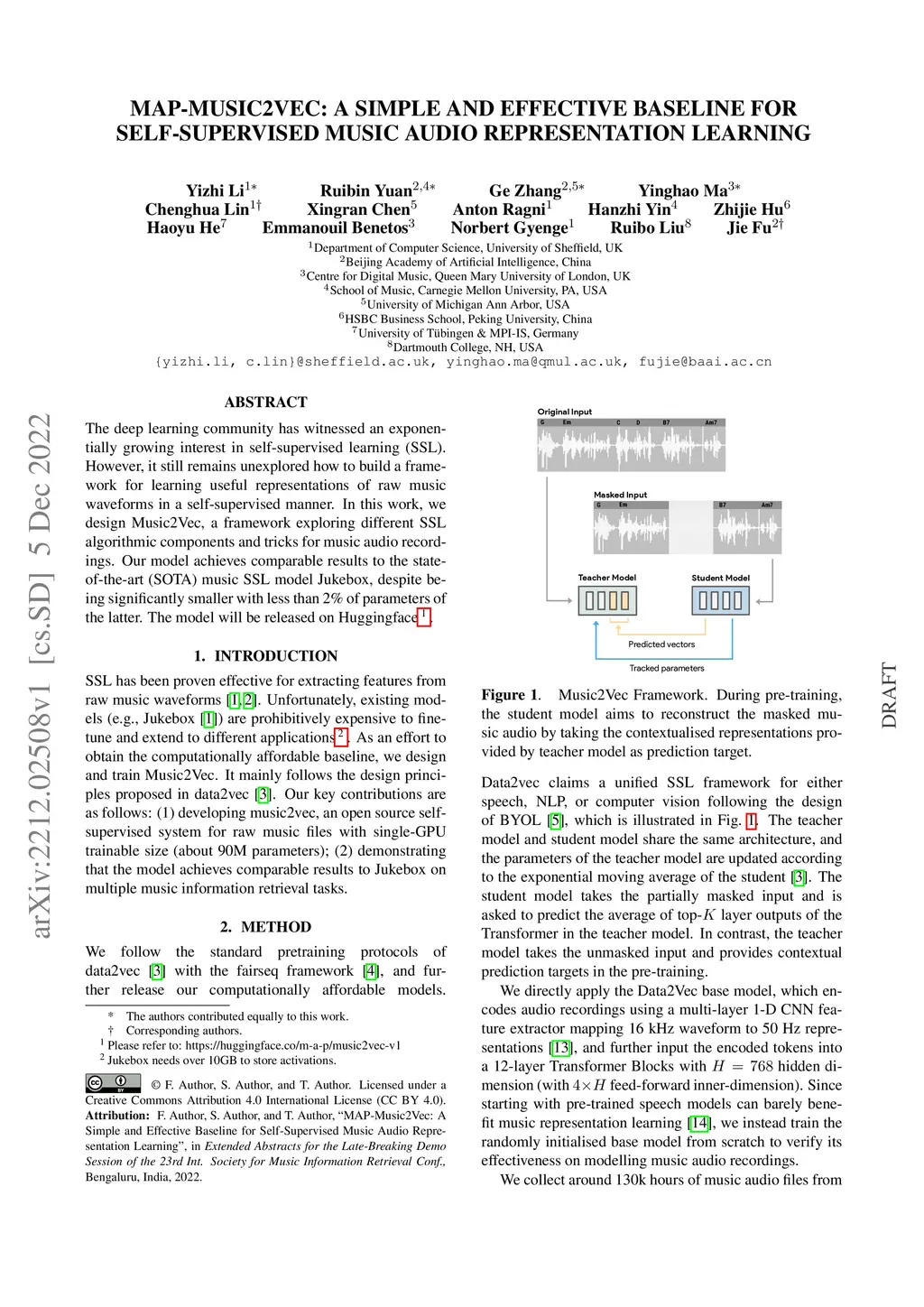 The deep learning community has witnessed an exponentially growing interest in self-supervised learning (SSL). However, it still remains unexplored how to build a framework for learning useful representations of raw music waveforms in a self-supervised manner. In this work, we design Music2Vec, a framework exploring different SSL algorithmic components and tricks for music audio recordings. Our model achieves comparable results to the state-of-the-art (SOTA) music SSL model Jukebox, despite being significantly smaller with less than 2% of parameters of the latter. The model will be released on Huggingface(Please refer to: https://huggingface.co/m-a-p/music2vec-v1)