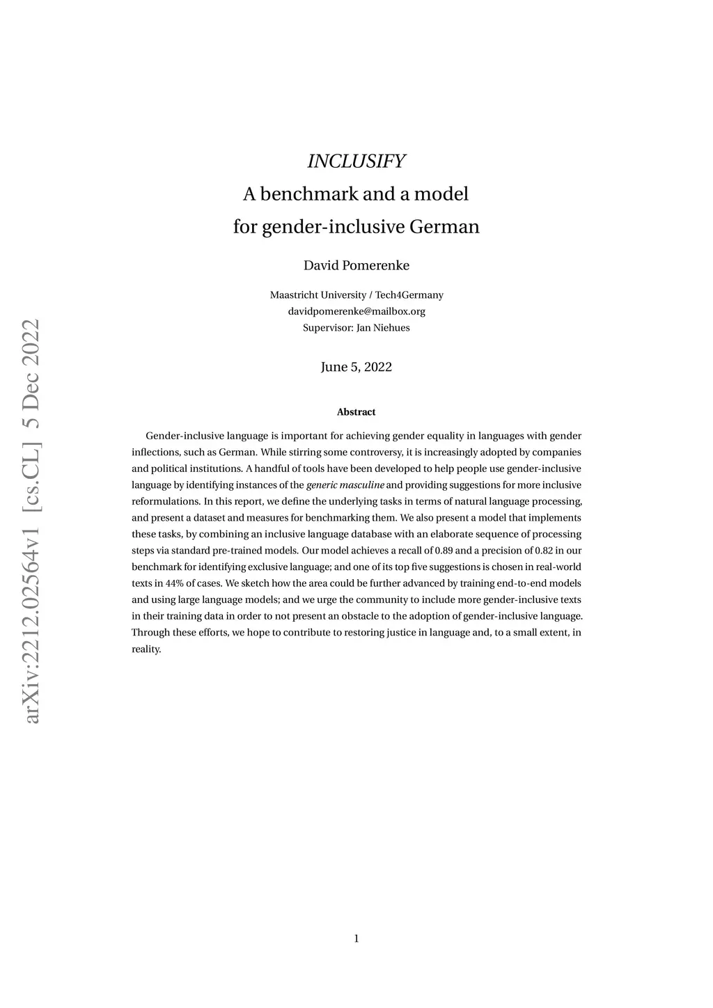 Gender-inclusive language is important for achieving gender equality in languages with gender inflections, such as German. While stirring some controversy, it is increasingly adopted by companies and political institutions. A handful of tools have been developed to help people use gender-inclusive language by identifying instances of the generic masculine and providing suggestions for more inclusive reformulations. In this report, we define the underlying tasks in terms of natural language processing, and present a dataset and measures for benchmarking them. We also present a model that implements these tasks, by combining an inclusive language database with an elaborate sequence of processing steps via standard pre-trained models. Our model achieves a recall of 0.89 and a precision of 0.82 in our benchmark for identifying exclusive language; and one of its top five suggestions is chosen in real-world texts in 44% of cases. We sketch how the area could be further advanced by training end-to-end models and using large language models; and we urge the community to include more gender-inclusive texts in their training data in order to not present an obstacle to the adoption of gender-inclusive language. Through these efforts, we hope to contribute to restoring justice in language and, to a small extent, in reality.