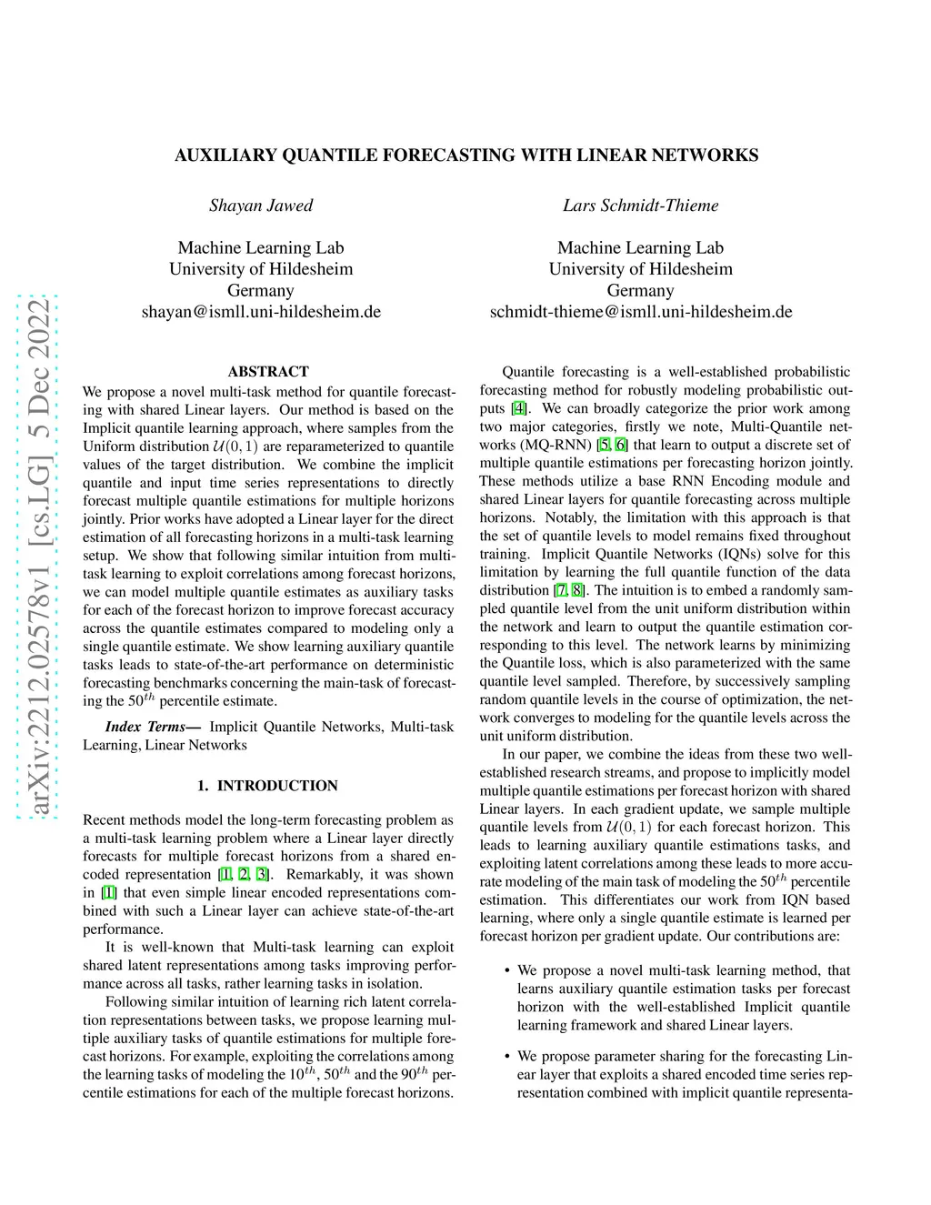We propose a novel multi-task method for quantile forecasting with shared Linear layers. Our method is based on the Implicit quantile learning approach, where samples from the Uniform distribution are reparameterized to quantile values of the target distribution. We combine the implicit quantile and input time series representations to directly forecast multiple quantile estimations for multiple horizons jointly. Prior works have adopted a Linear layer for the direct estimation of all forecasting horizons in a multi-task learning setup. We show that following similar intuition from multi-task learning to exploit correlations among forecast horizons, we can model multiple quantile estimates as auxiliary tasks for each of the forecast horizon to improve forecast accuracy across the quantile estimates compared to modeling only a single quantile estimate. We show learning auxiliary quantile tasks leads to state-of-the-art performance on deterministic forecasting benchmarks concerning the main-task of forecasting the 50 percentile estimate.