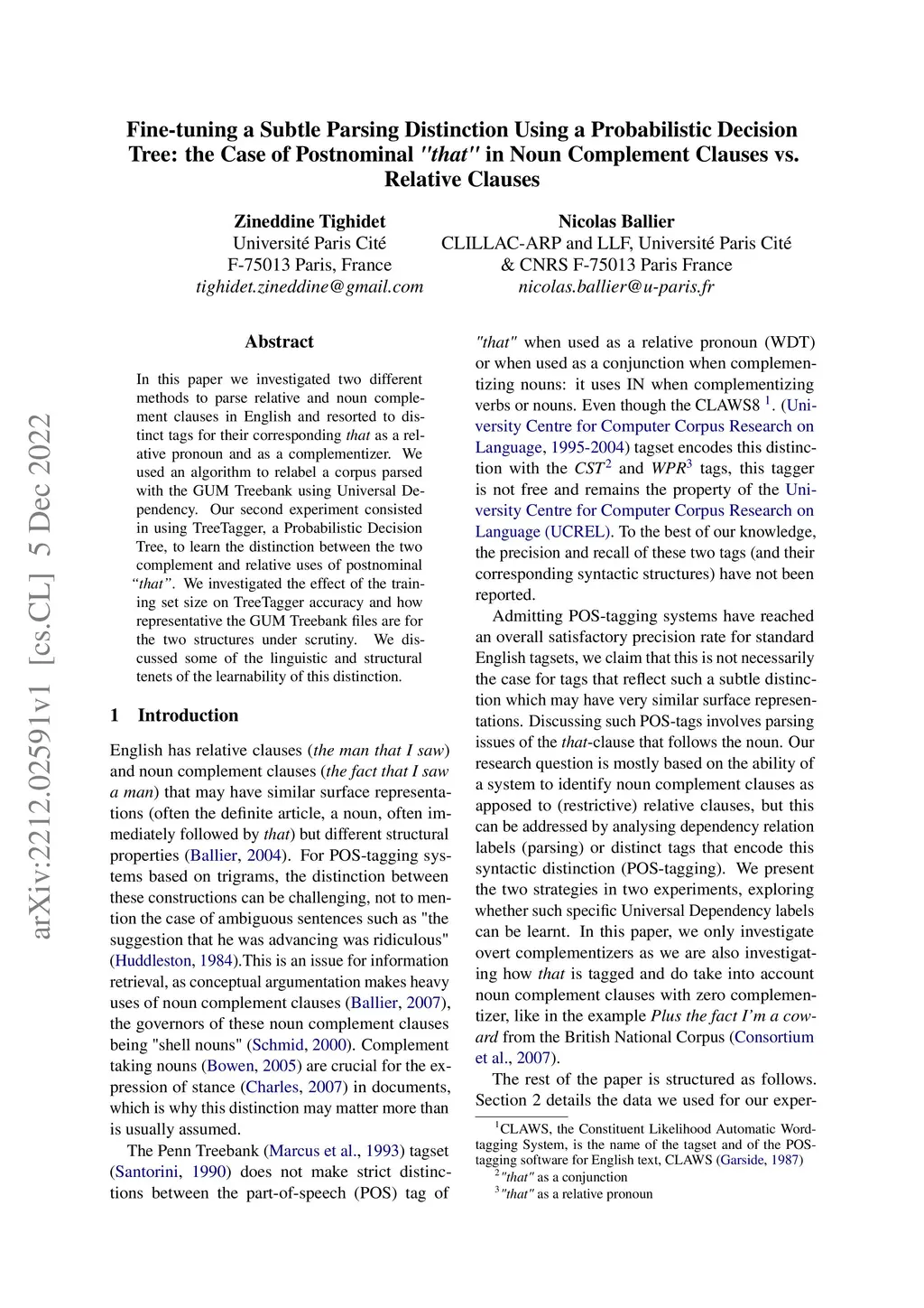 In this paper we investigated two different methods to parse relative and noun complement clauses in English and resorted to distinct tags for their corresponding that as a relative pronoun and as a complementizer. We used an algorithm to relabel a corpus parsed with the GUM Treebank using Universal Dependency. Our second experiment consisted in using TreeTagger, a Probabilistic Decision Tree, to learn the distinction between the two complement and relative uses of postnominal "that". We investigated the effect of the training set size on TreeTagger accuracy and how representative the GUM Treebank files are for the two structures under scrutiny. We discussed some of the linguistic and structural tenets of the learnability of this distinction.
