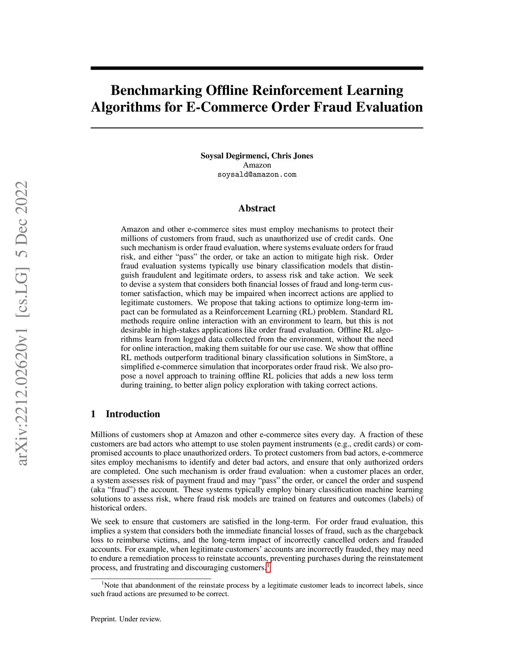 Amazon and other e-commerce sites must employ mechanisms to protect their millions of customers from fraud, such as unauthorized use of credit cards. One such mechanism is order fraud evaluation, where systems evaluate orders for fraud risk, and either "pass" the order, or take an action to mitigate high risk. Order fraud evaluation systems typically use binary classification models that distinguish fraudulent and legitimate orders, to assess risk and take action. We seek to devise a system that considers both financial losses of fraud and long-term customer satisfaction, which may be impaired when incorrect actions are applied to legitimate customers. We propose that taking actions to optimize long-term impact can be formulated as a Reinforcement Learning (RL) problem. Standard RL methods require online interaction with an environment to learn, but this is not desirable in high-stakes applications like order fraud evaluation. Offline RL algorithms learn from logged data collected from the environment, without the need for online interaction, making them suitable for our use case. We show that offline RL methods outperform traditional binary classification solutions in SimStore, a simplified e-commerce simulation that incorporates order fraud risk. We also propose a novel approach to training offline RL policies that adds a new loss term during training, to better align policy exploration with taking correct actions.