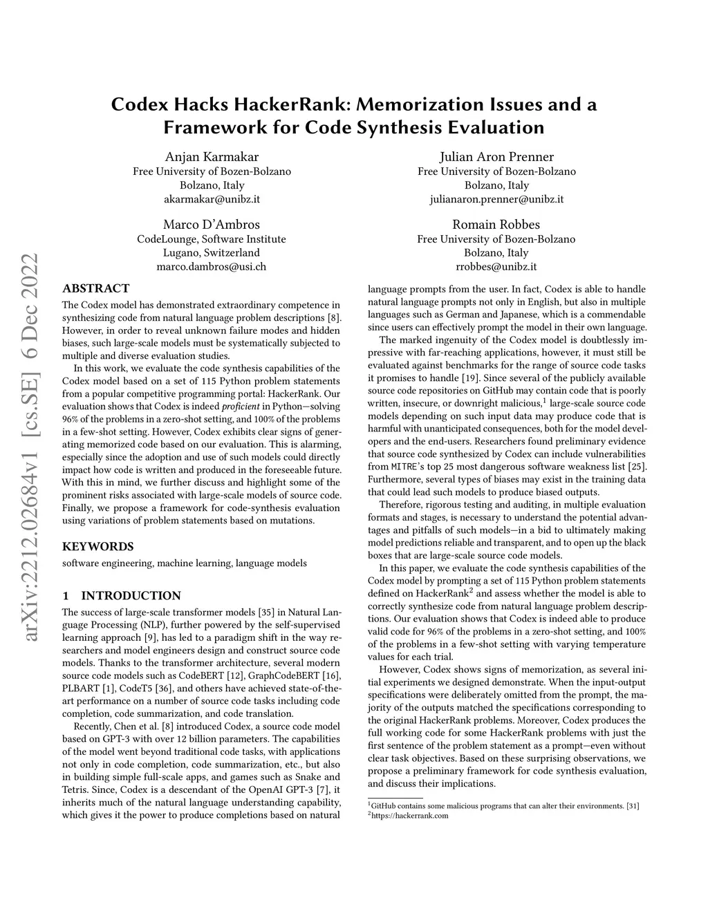 The Codex model has demonstrated extraordinary competence in synthesizing code from natural language problem descriptions. However, in order to reveal unknown failure modes and hidden biases, such large-scale models must be systematically subjected to multiple and diverse evaluation studies. In this work, we evaluate the code synthesis capabilities of the Codex model based on a set of 115 Python problem statements from a popular competitive programming portal: HackerRank. Our evaluation shows that Codex is indeed proficient in Python, solving 96% of the problems in a zero-shot setting, and 100% of the problems in a few-shot setting. However, Codex exhibits clear signs of generating memorized code based on our evaluation. This is alarming, especially since the adoption and use of such models could directly impact how code is written and produced in the foreseeable future. With this in mind, we further discuss and highlight some of the prominent risks associated with large-scale models of source code. Finally, we propose a framework for code-synthesis evaluation using variations of problem statements based on mutations.