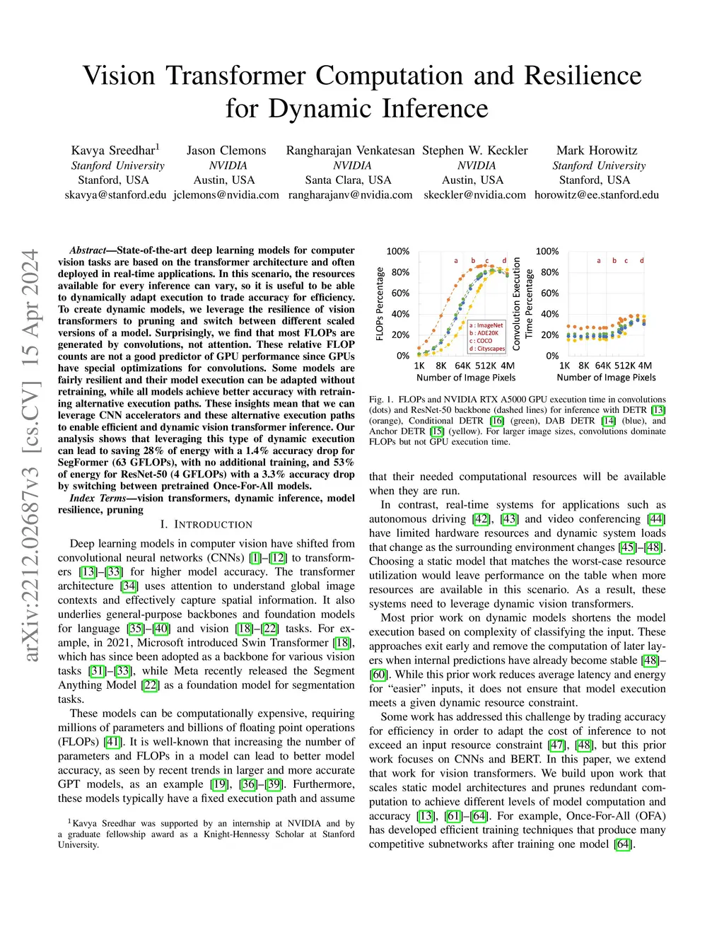 State-of-the-art deep learning models for computer vision tasks are based on the transformer architecture and often deployed in real-time applications. In this scenario, the resources available for every inference can vary, so it is useful to be able to dynamically adapt execution to trade accuracy for efficiency. To create dynamic models, we leverage the resilience of vision transformers to pruning and switch between different scaled versions of a model. Surprisingly, we find that most FLOPs are generated by convolutions, not attention. These relative FLOP counts are not a good predictor of GPU performance since GPUs have special optimizations for convolutions. Some models are fairly resilient and their model execution can be adapted without retraining, while all models achieve better accuracy with retraining alternative execution paths. These insights mean that we can leverage CNN accelerators and these alternative execution paths to enable efficient and dynamic vision transformer inference. Our analysis shows that leveraging this type of dynamic execution can lead to saving 28\% of energy with a 1.4\% accuracy drop for SegFormer (63 GFLOPs), with no additional training, and 53\% of energy for ResNet-50 (4 GFLOPs) with a 3.3\% accuracy drop by switching between pretrained Once-For-All models.