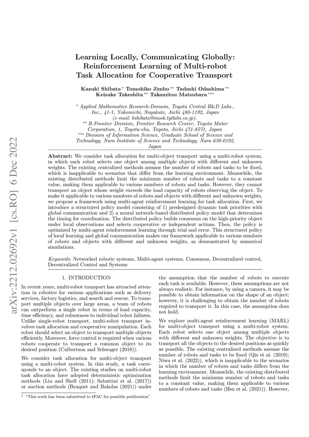 We consider task allocation for multi-object transport using a multi-robot system, in which each robot selects one object among multiple objects with different and unknown weights. The existing centralized methods assume the number of robots and tasks to be fixed, which is inapplicable to scenarios that differ from the learning environment. Meanwhile, the existing distributed methods limit the minimum number of robots and tasks to a constant value, making them applicable to various numbers of robots and tasks. However, they cannot transport an object whose weight exceeds the load capacity of robots observing the object. To make it applicable to various numbers of robots and objects with different and unknown weights, we propose a framework using multi-agent reinforcement learning for task allocation. First, we introduce a structured policy model consisting of 1) predesigned dynamic task priorities with global communication and 2) a neural network-based distributed policy model that determines the timing for coordination. The distributed policy builds consensus on the high-priority object under local observations and selects cooperative or independent actions. Then, the policy is optimized by multi-agent reinforcement learning through trial and error. This structured policy of local learning and global communication makes our framework applicable to various numbers of robots and objects with different and unknown weights, as demonstrated by numerical simulations.