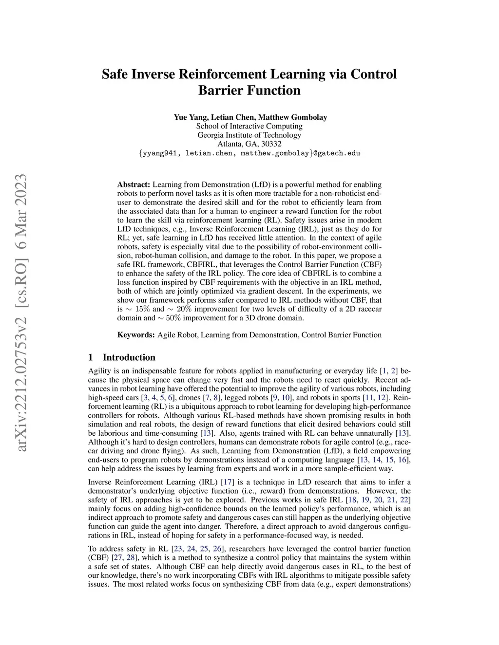 Learning from Demonstration (LfD) is a powerful method for enabling robots to perform novel tasks as it is often more tractable for a non-roboticist end-user to demonstrate the desired skill and for the robot to efficiently learn from the associated data than for a human to engineer a reward function for the robot to learn the skill via reinforcement learning (RL). Safety issues arise in modern LfD techniques, e.g., Inverse Reinforcement Learning (IRL), just as they do for RL; yet, safe learning in LfD has received little attention. In the context of agile robots, safety is especially vital due to the possibility of robot-environment collision, robot-human collision, and damage to the robot. In this paper, we propose a safe IRL framework, CBFIRL, that leverages the Control Barrier Function (CBF) to enhance the safety of the IRL policy. The core idea of CBFIRL is to combine a loss function inspired by CBF requirements with the objective in an IRL method, both of which are jointly optimized via gradient descent. In the experiments, we show our framework performs safer compared to IRL methods without CBF, that is and improvement for two levels of difficulty of a 2D racecar domain and improvement for a 3D drone domain.