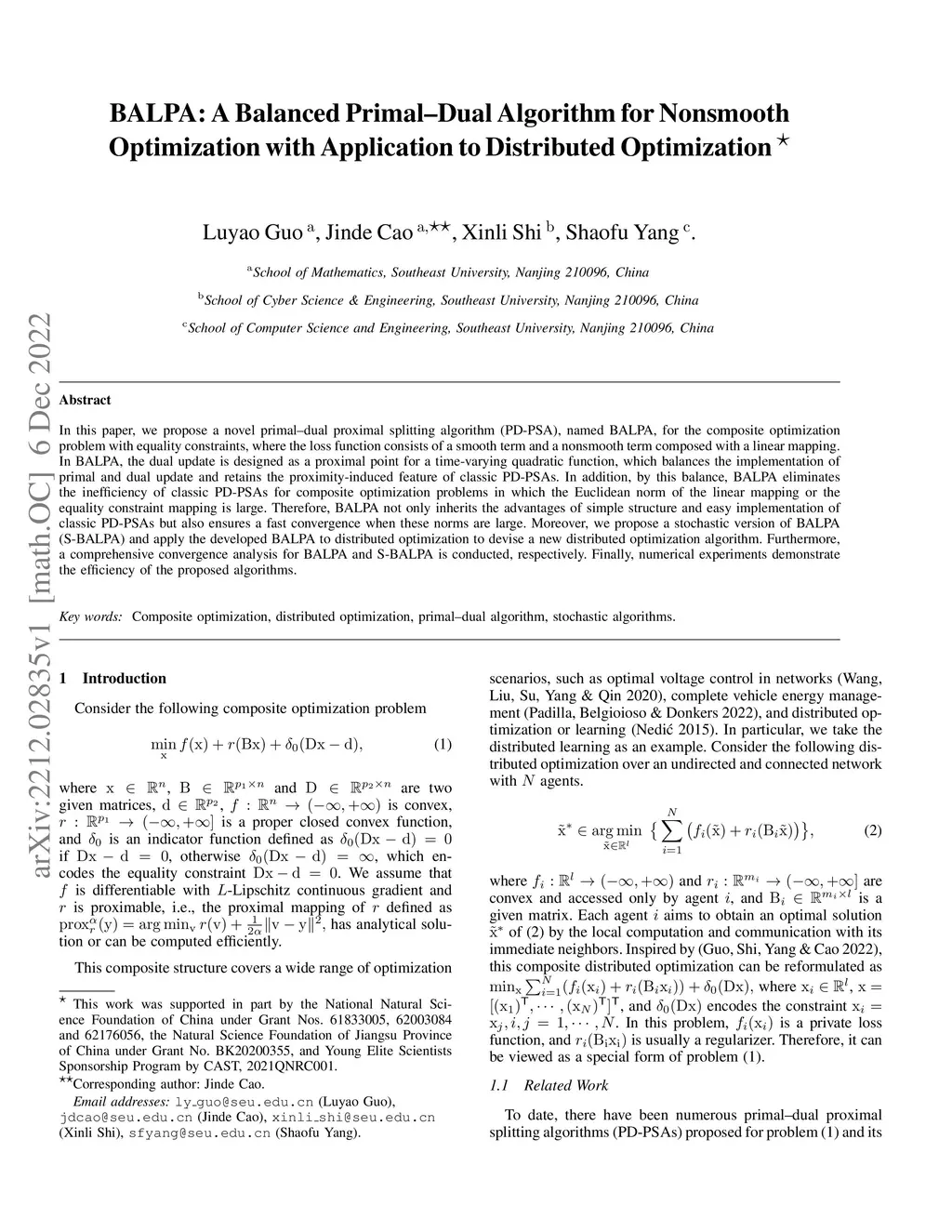 In this paper, we propose a novel primal-dual proximal splitting algorithm (PD-PSA), named BALPA, for the composite optimization problem with equality constraints, where the loss function consists of a smooth term and a nonsmooth term composed with a linear mapping. In BALPA, the dual update is designed as a proximal point for a time-varying quadratic function, which balances the implementation of primal and dual update and retains the proximity-induced feature of classic PD-PSAs. In addition, by this balance, BALPA eliminates the inefficiency of classic PD-PSAs for composite optimization problems in which the Euclidean norm of the linear mapping or the equality constraint mapping is large. Therefore, BALPA not only inherits the advantages of simple structure and easy implementation of classic PD-PSAs but also ensures a fast convergence when these norms are large. Moreover, we propose a stochastic version of BALPA (S-BALPA) and apply the developed BALPA to distributed optimization to devise a new distributed optimization algorithm. Furthermore, a comprehensive convergence analysis for BALPA and S-BALPA is conducted, respectively. Finally, numerical experiments demonstrate the efficiency of the proposed algorithms.