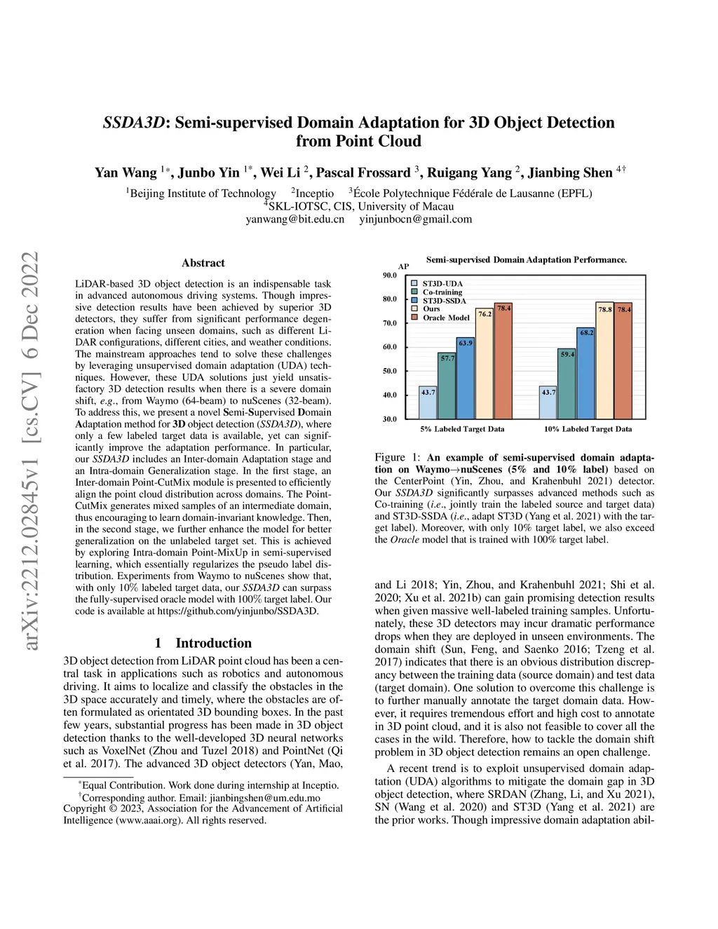 SSDA3D: Semi-supervised Domain Adaptation for 3D Object Detection from
