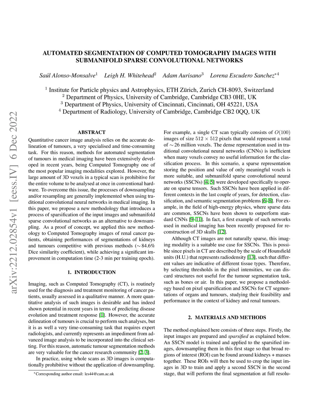 Quantitative cancer image analysis relies on the accurate delineation of tumours, a very specialised and time-consuming task. For this reason, methods for automated segmentation of tumours in medical imaging have been extensively developed in recent years, being Computed Tomography one of the most popular imaging modalities explored. However, the large amount of 3D voxels in a typical scan is prohibitive for the entire volume to be analysed at once in conventional hardware. To overcome this issue, the processes of downsampling and/or resampling are generally implemented when using traditional convolutional neural networks in medical imaging. In this paper, we propose a new methodology that introduces a process of sparsification of the input images and submanifold sparse convolutional networks as an alternative to downsampling. As a proof of concept, we applied this new methodology to Computed Tomography images of renal cancer patients, obtaining performances of segmentations of kidneys and tumours competitive with previous methods (~84.6% Dice similarity coefficient), while achieving a significant improvement in computation time (2-3 min per training epoch).