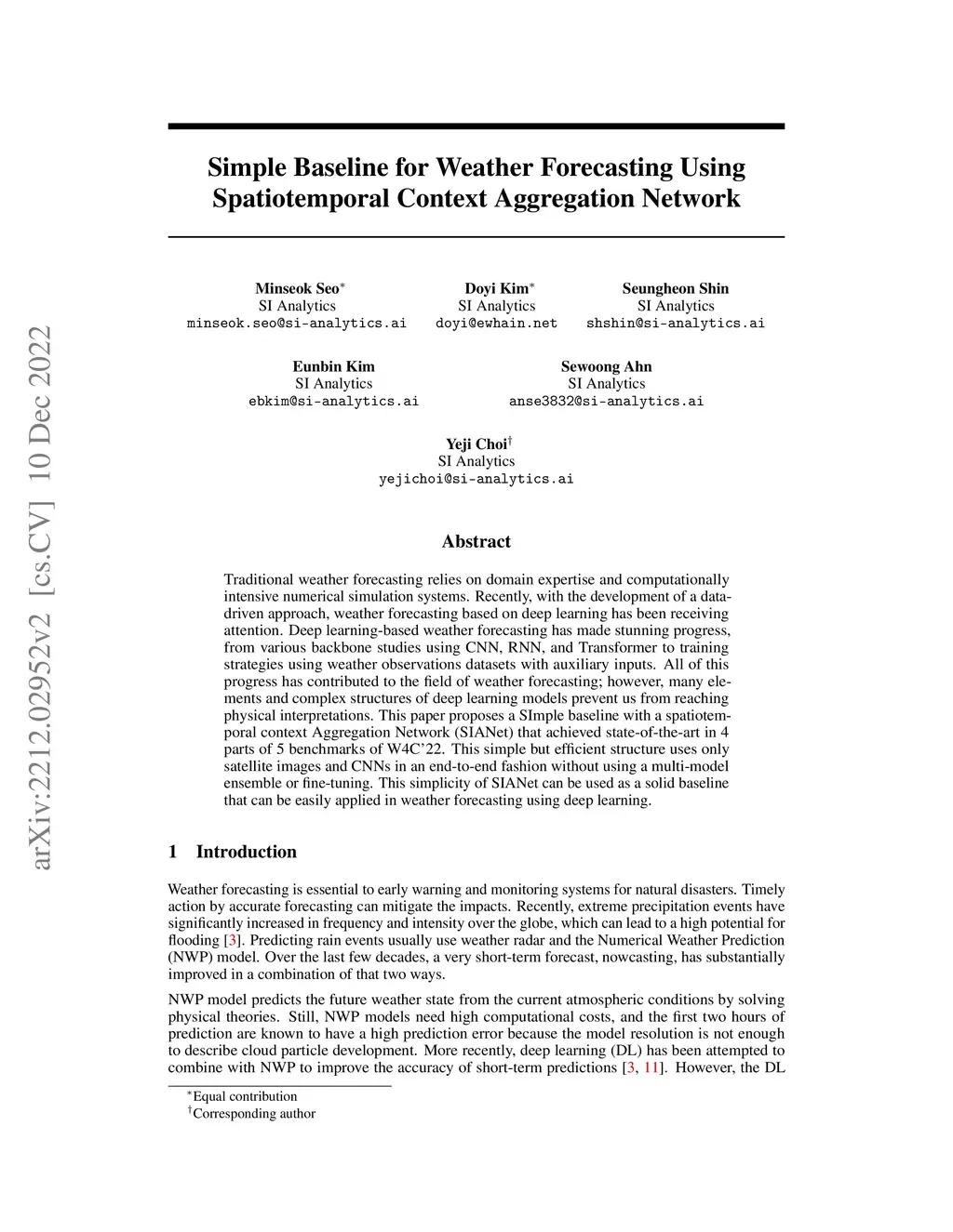 Traditional weather forecasting relies on domain expertise and computationally intensive numerical simulation systems. Recently, with the development of a data-driven approach, weather forecasting based on deep learning has been receiving attention. Deep learning-based weather forecasting has made stunning progress, from various backbone studies using CNN, RNN, and Transformer to training strategies using weather observations datasets with auxiliary inputs. All of this progress has contributed to the field of weather forecasting; however, many elements and complex structures of deep learning models prevent us from reaching physical interpretations. This paper proposes a SImple baseline with a spatiotemporal context Aggregation Network (SIANet) that achieved state-of-the-art in 4 parts of 5 benchmarks of W4C22. This simple but efficient structure uses only satellite images and CNNs in an end-to-end fashion without using a multi-model ensemble or fine-tuning. This simplicity of SIANet can be used as a solid baseline that can be easily applied in weather forecasting using deep learning.